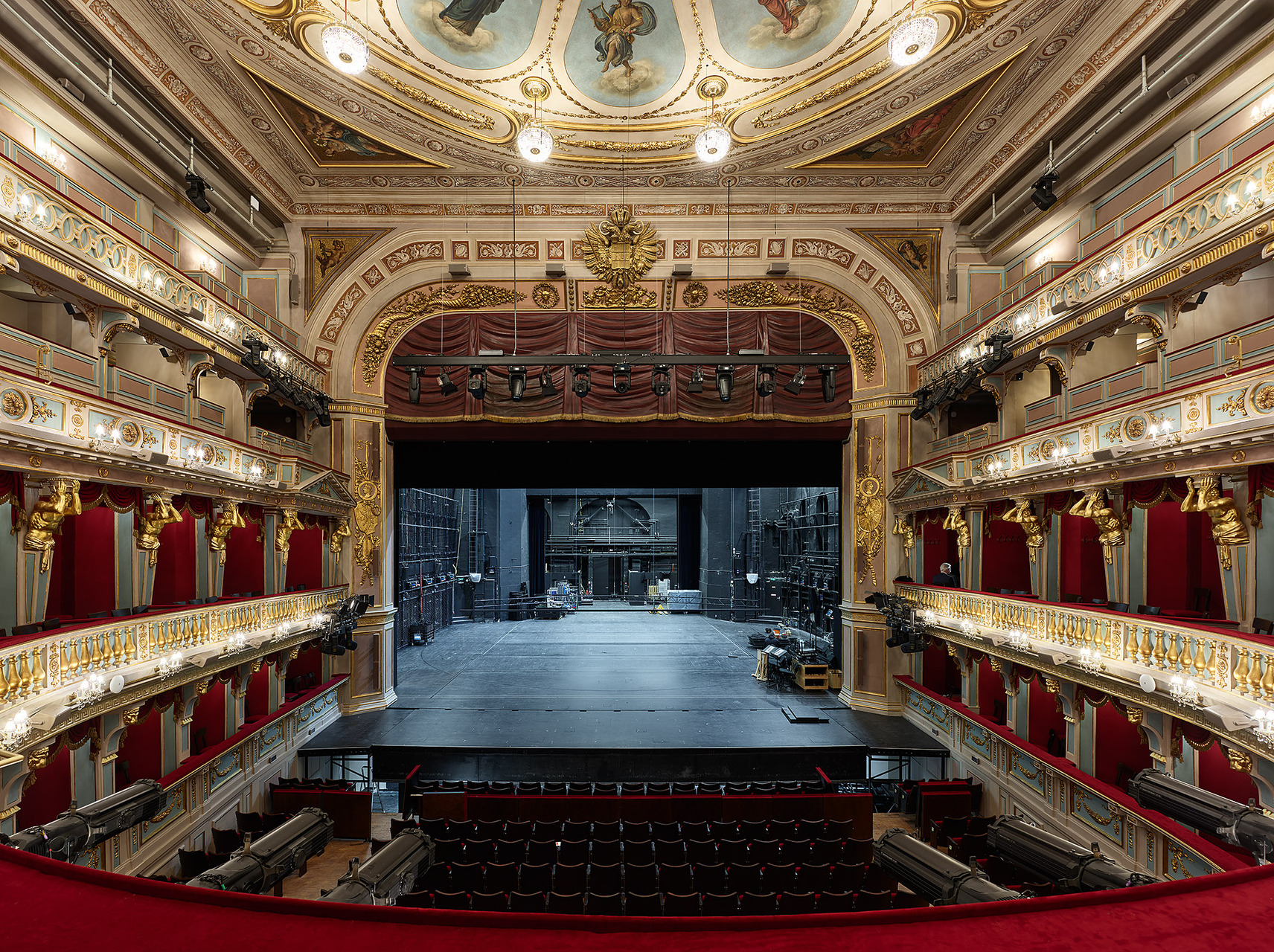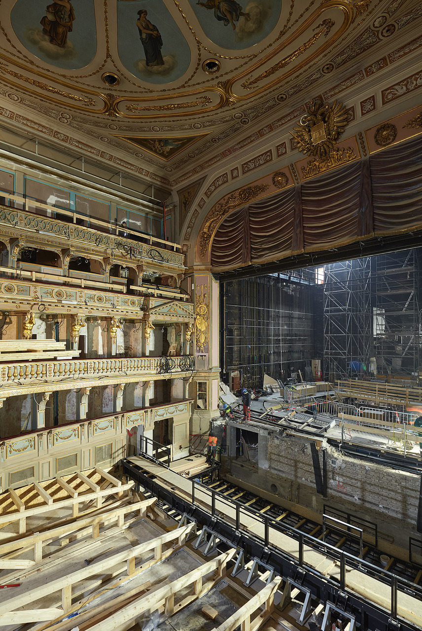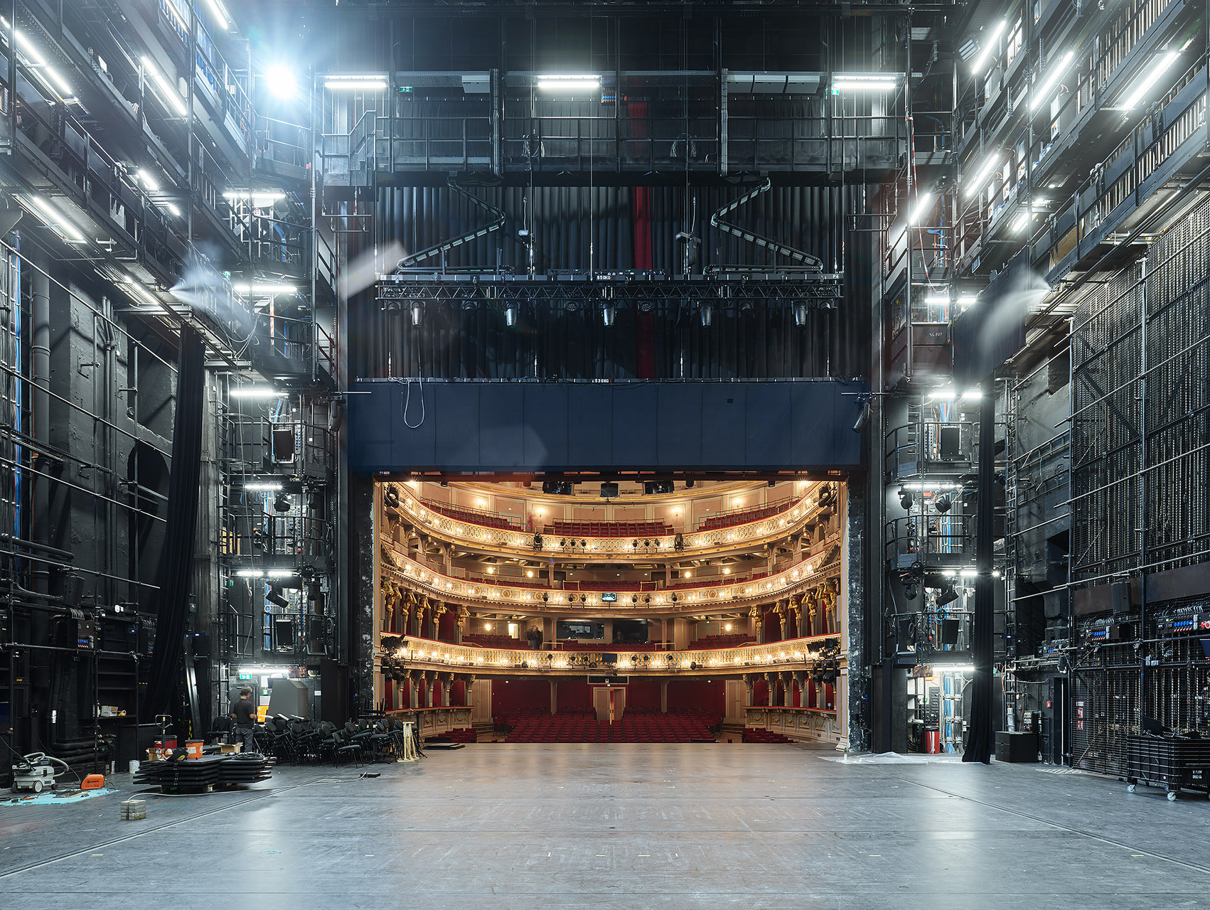 Ein Theater ist eine Maschine: Etwa 80 bis 85 Menschen arbeiten in der Bühnentechnik, es braucht kleine Werkstätten zur Montage, eine Einbringöffnung für Hubbühnen, zwischen Bühnen- und Schnürboden liegen 22 Meter. Der Orchestergraben ist 4,70 Meter tief, er musste unterfangen werden; das Parkett bekam einen neuen, ansteigenden Boden, aus dem Frischluft strömt, unter den ersten Sesselreihen parkt das Stuhllager.