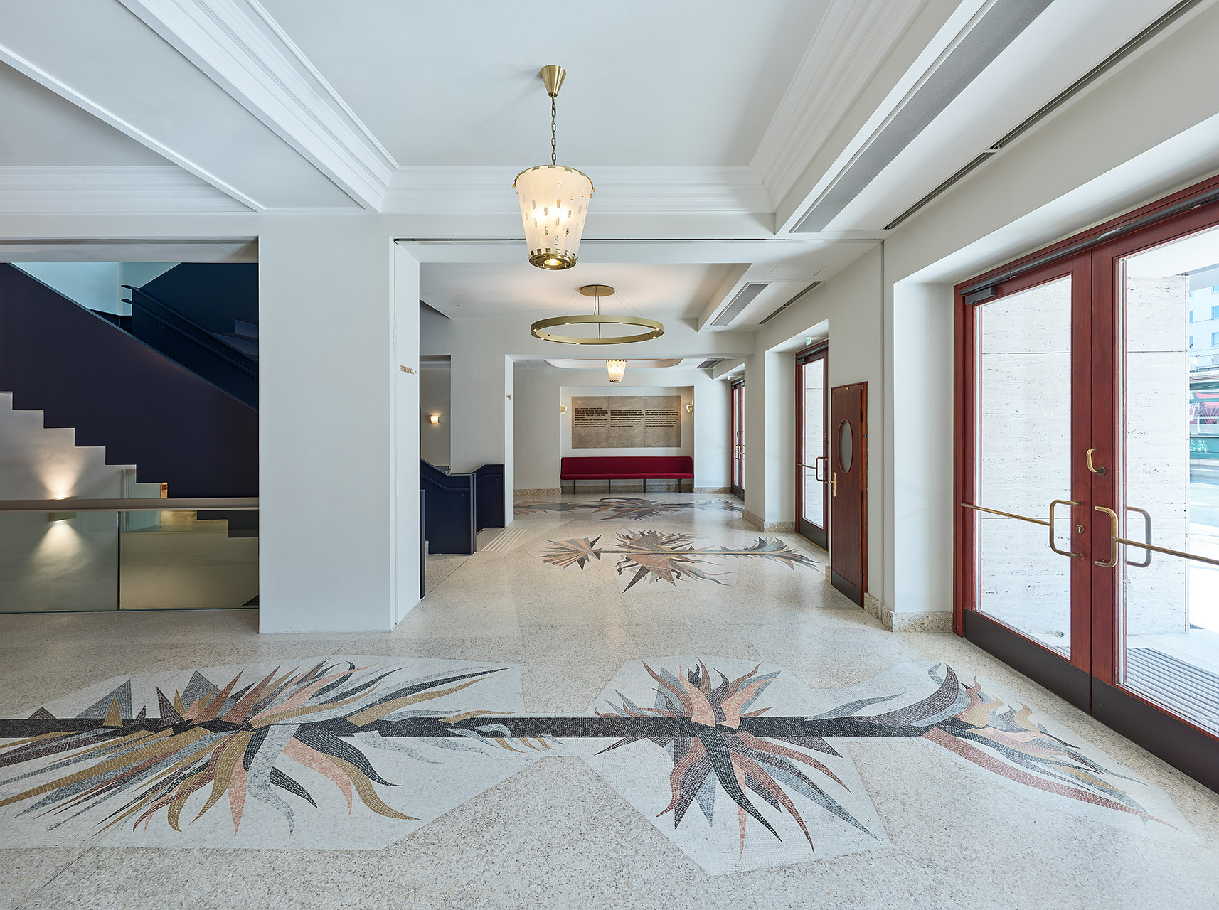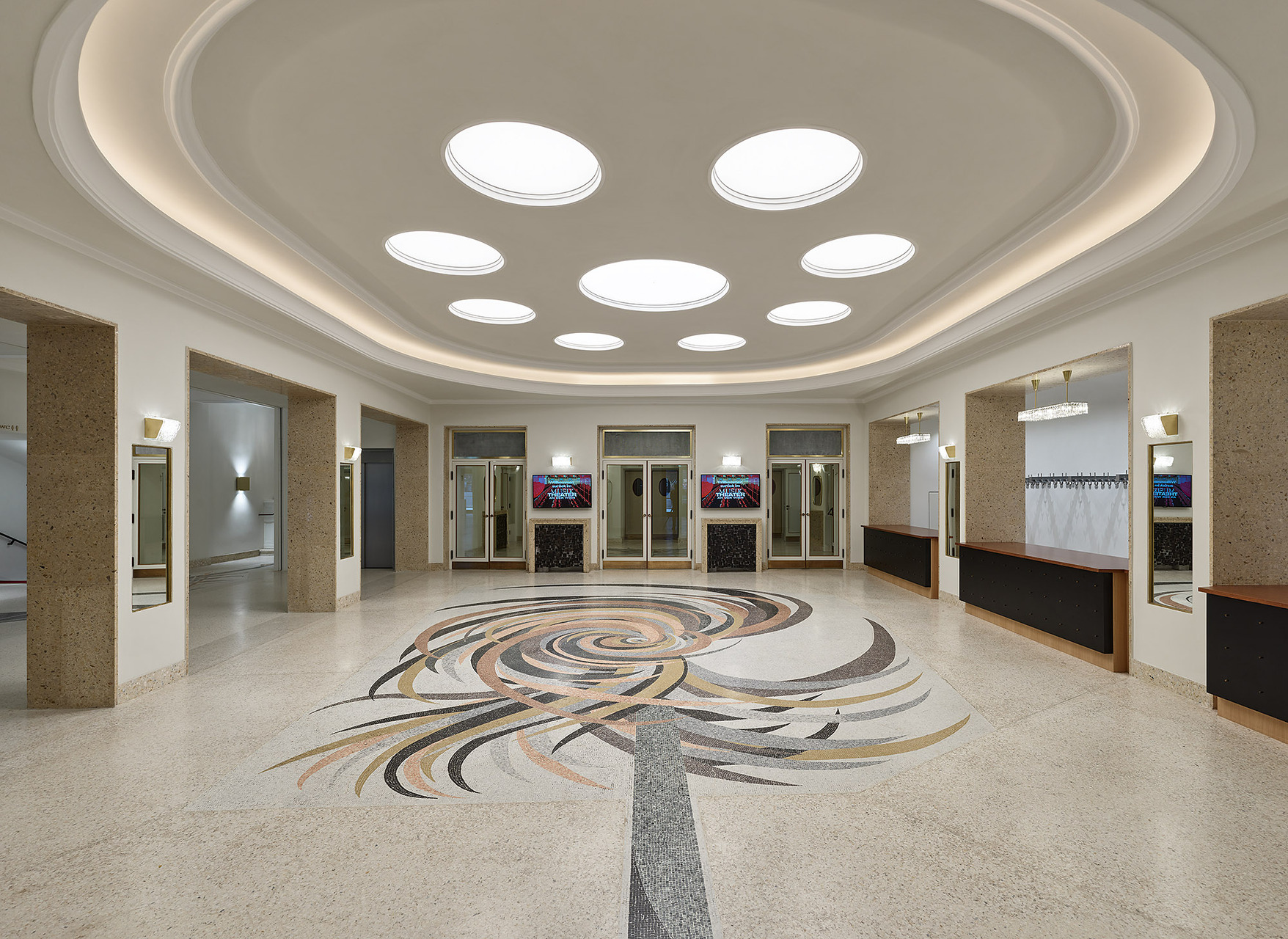 Der unauffällige Charme der 1950er-Jahre kommt im nunmehr aufgeräumten Umfeld viel besser zur Geltung. Man nimmt die eigenartig reizvollen Mosaikarbeiten von Wolfgang Hutter und Roman Haller besser wahr, dasselbe gilt für Garderoben, Lampen, Spiegel. Auch die Bestuhlung aus den 1960er-Jahren blieb. „Es sind solide Sessel mit guten akustischen Eigenschaften. Die konnte man durchaus wiederverwenden“, erklärt Bammer. Alle originalen Möbel, Türen, Luster, Wandbespannungen, Brüstungen, Kyriatiden wurden in Absprache mit dem Bundesdenkmalamt sorgfältig saniert. Der Saal strahlt wieder.