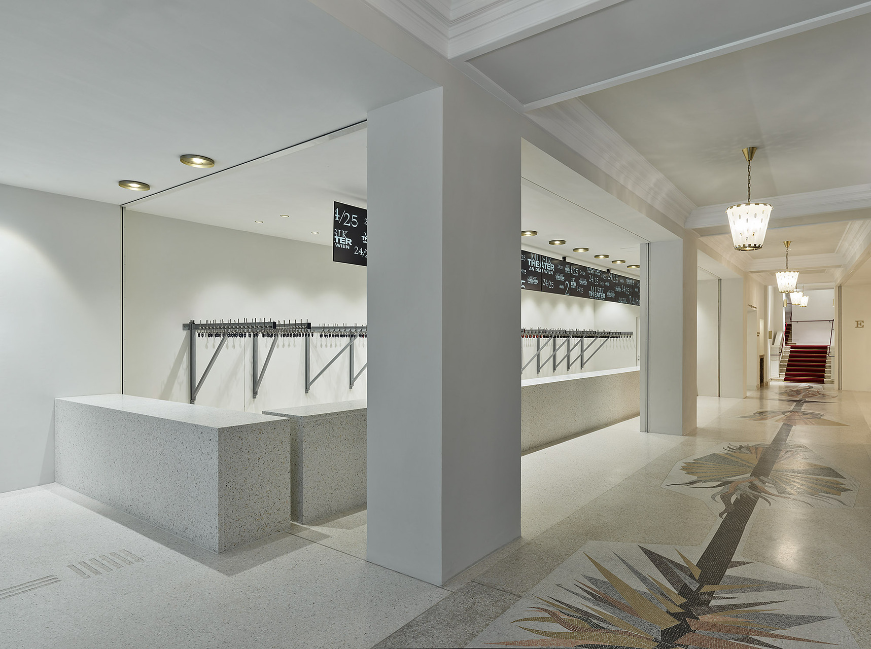 Betritt man das Theater, herrscht nun eine ganz andere Atmosphäre: Die Entkernung tat ihm gut, das Foyer wirkt auf einmal luftig. Es sind einfach alle Zwischenwände weg, kein Sanitärkern an der falschen Stelle und keine Stiege, die das Foyer zum Gang reduzieren. Stattdessen eine offene Treppe, die den Blick nach oben zieht und zwischen ihren Untersichten seitlich weiter. Trotzdem ist das Wesen des Theaters noch dasselbe, um nicht zu sagen: Es kam noch mehr zu sich.