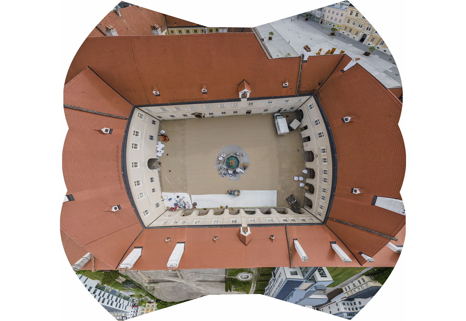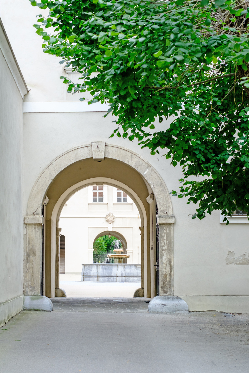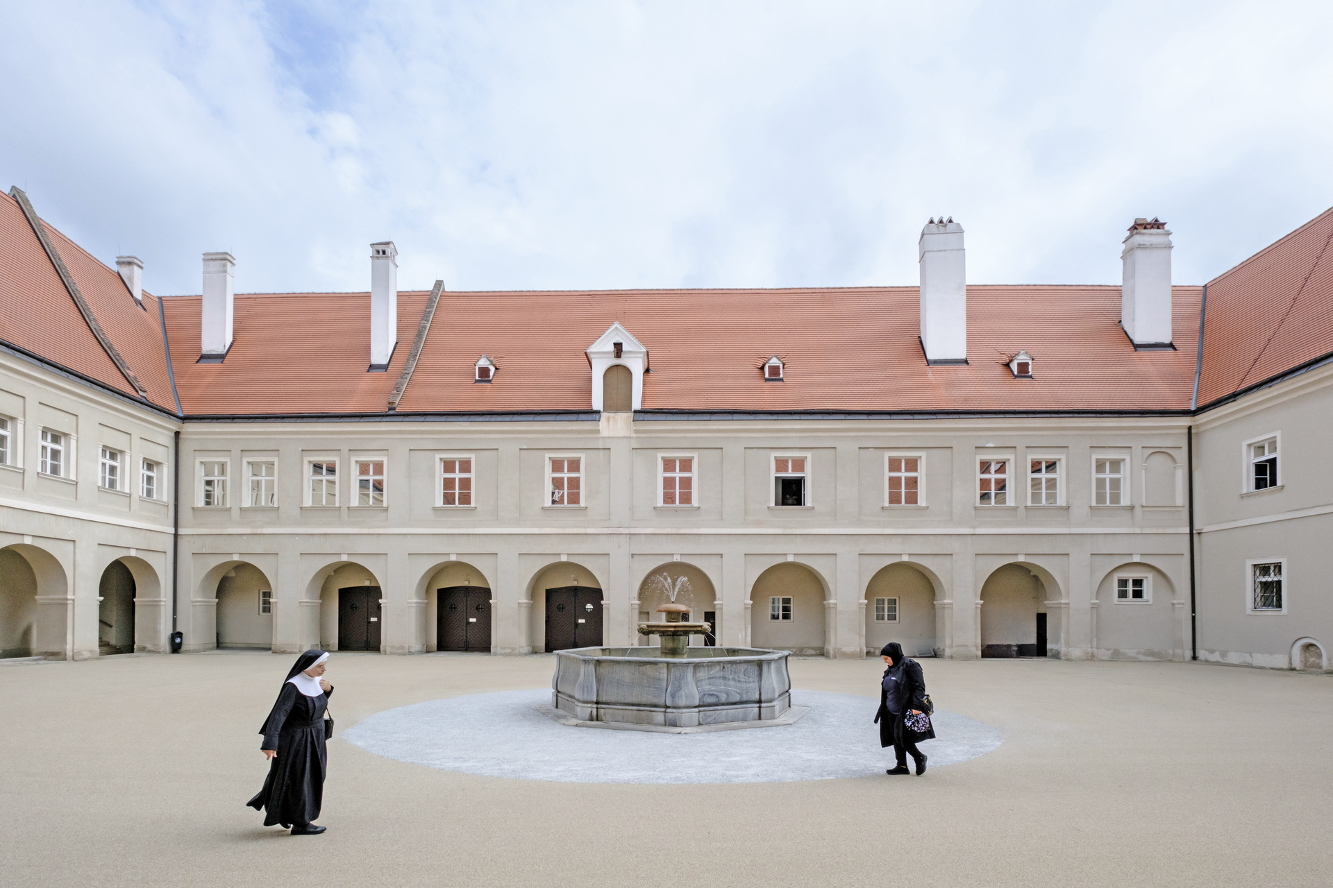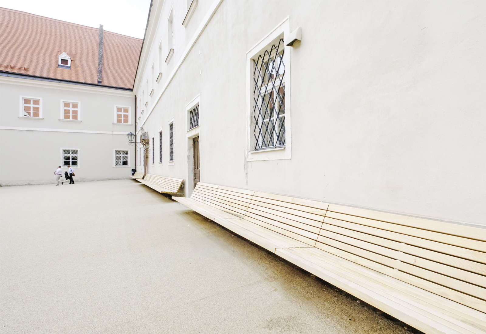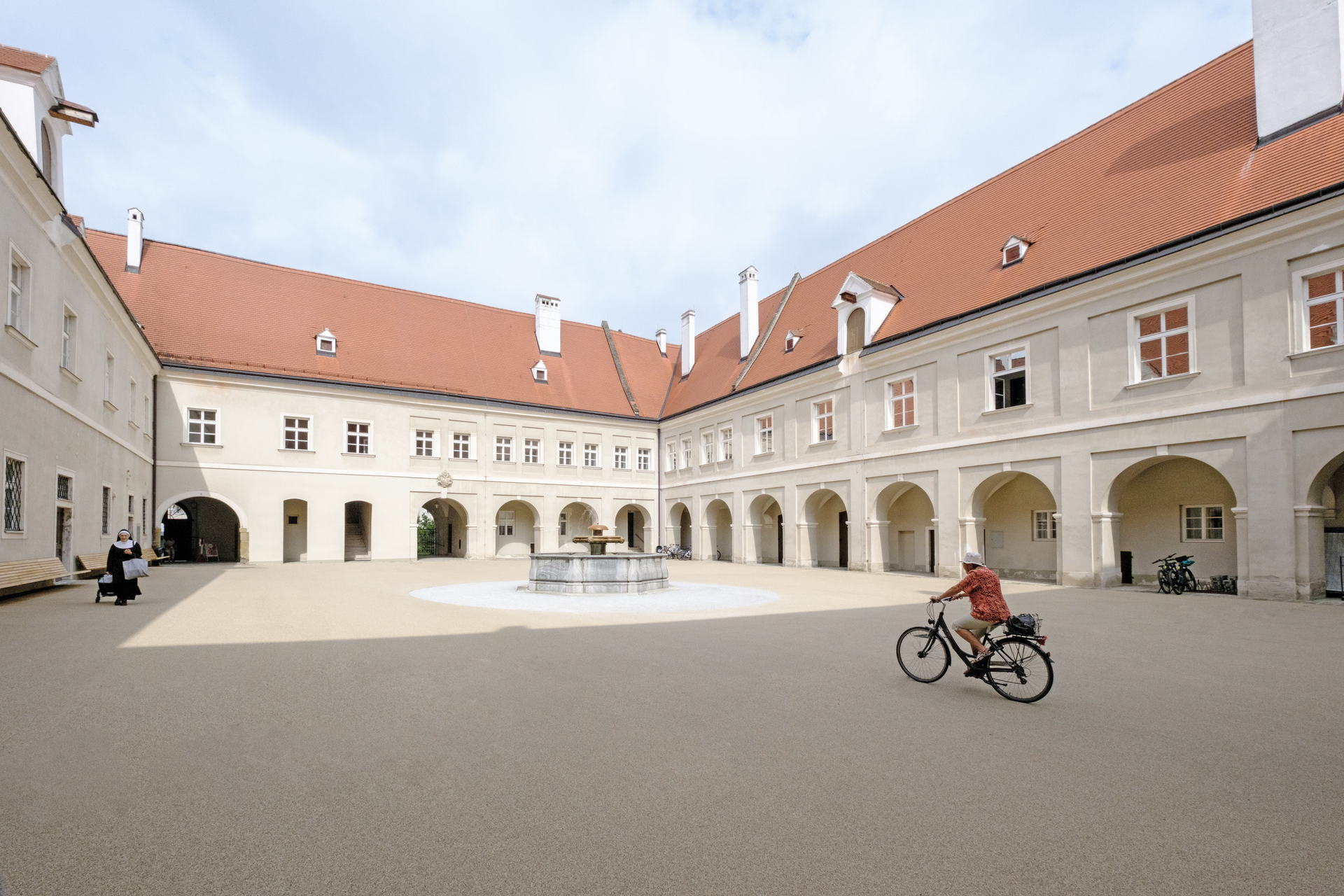 Entlang der Südwand laden lange Sitzbänke dazu ein, geschützt durch die Mauer im Rücken und untermalt vom Plätschern, sich den Gedanken hinzugeben. Der Brunnenhof, wenngleich immer noch befahrbar, bildet einen Gegenpol zum Getümmel der Altstadt, einen Rückzugsort hinter den ehemaligen Klostermauern. (Autor: Achim Geissinger, nach einem Text der Architekten)