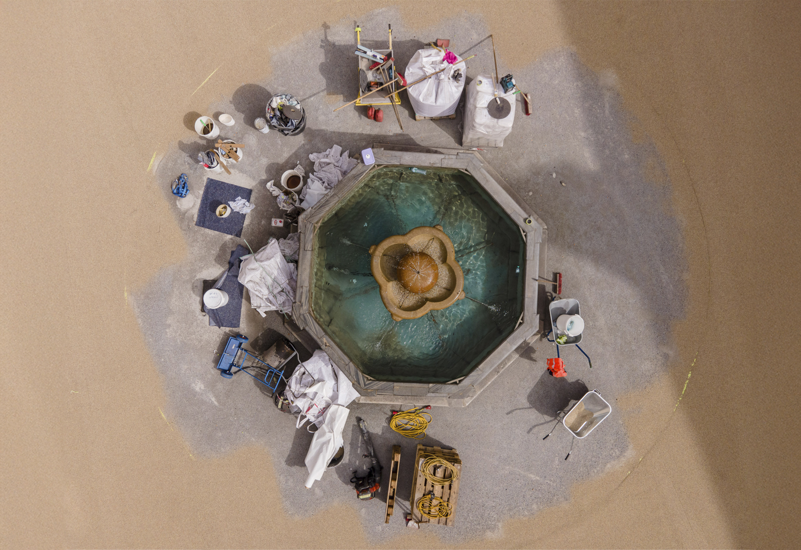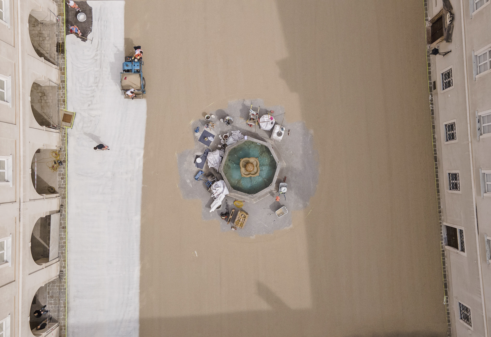 Das architektonische Konzept beruht auf der Vorstellung der Ausdehnung von Vorhandenem: Der aus Wachauer Marmor gefertigte Brunnen wurde um einen Bodenkreis aus demselben Material erweitert und dadurch mit neuer Präsenz versehen. Das zweistufige Podest verschwand darunter, der Brunnen wird dadurch einsehbar und zugänglich.