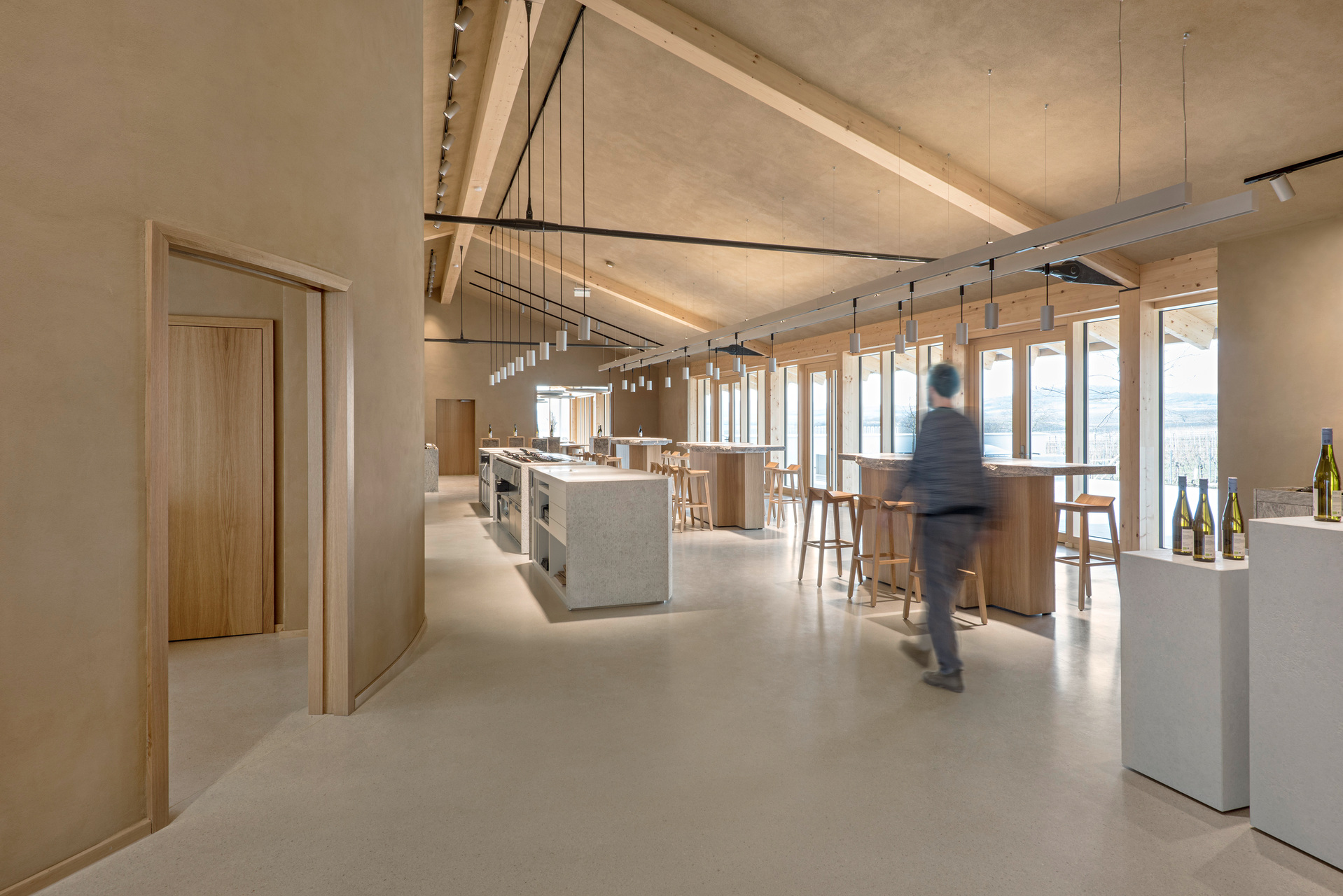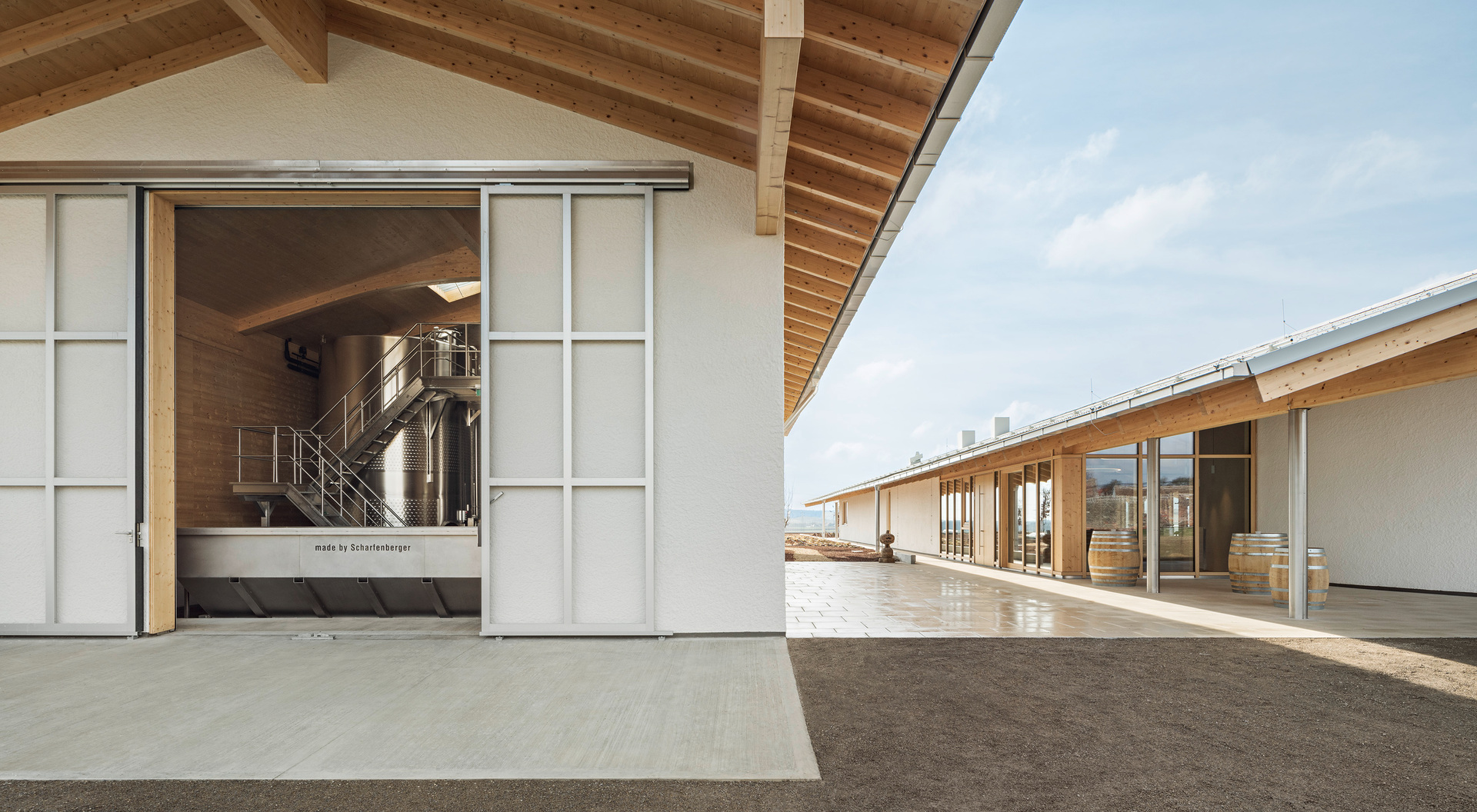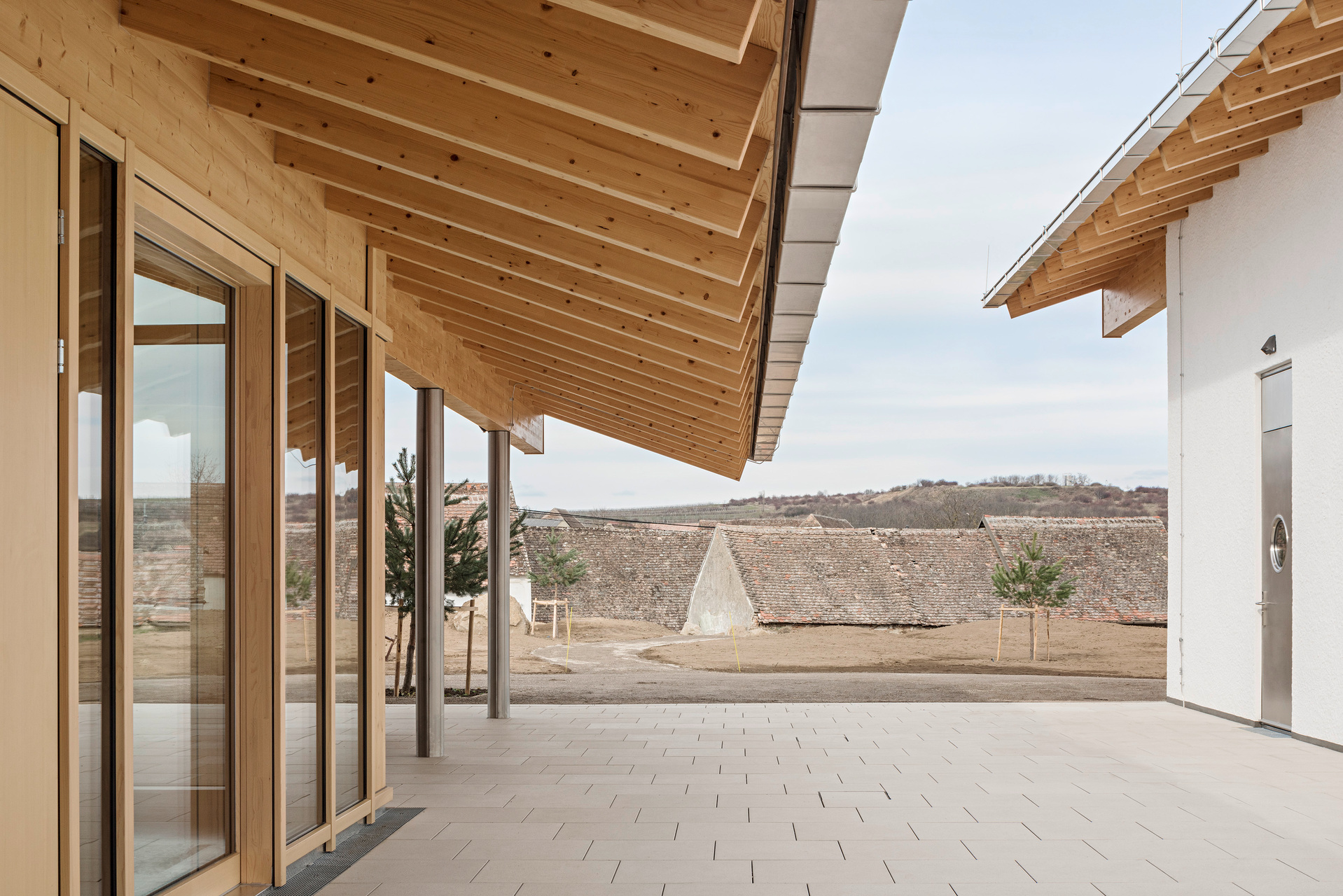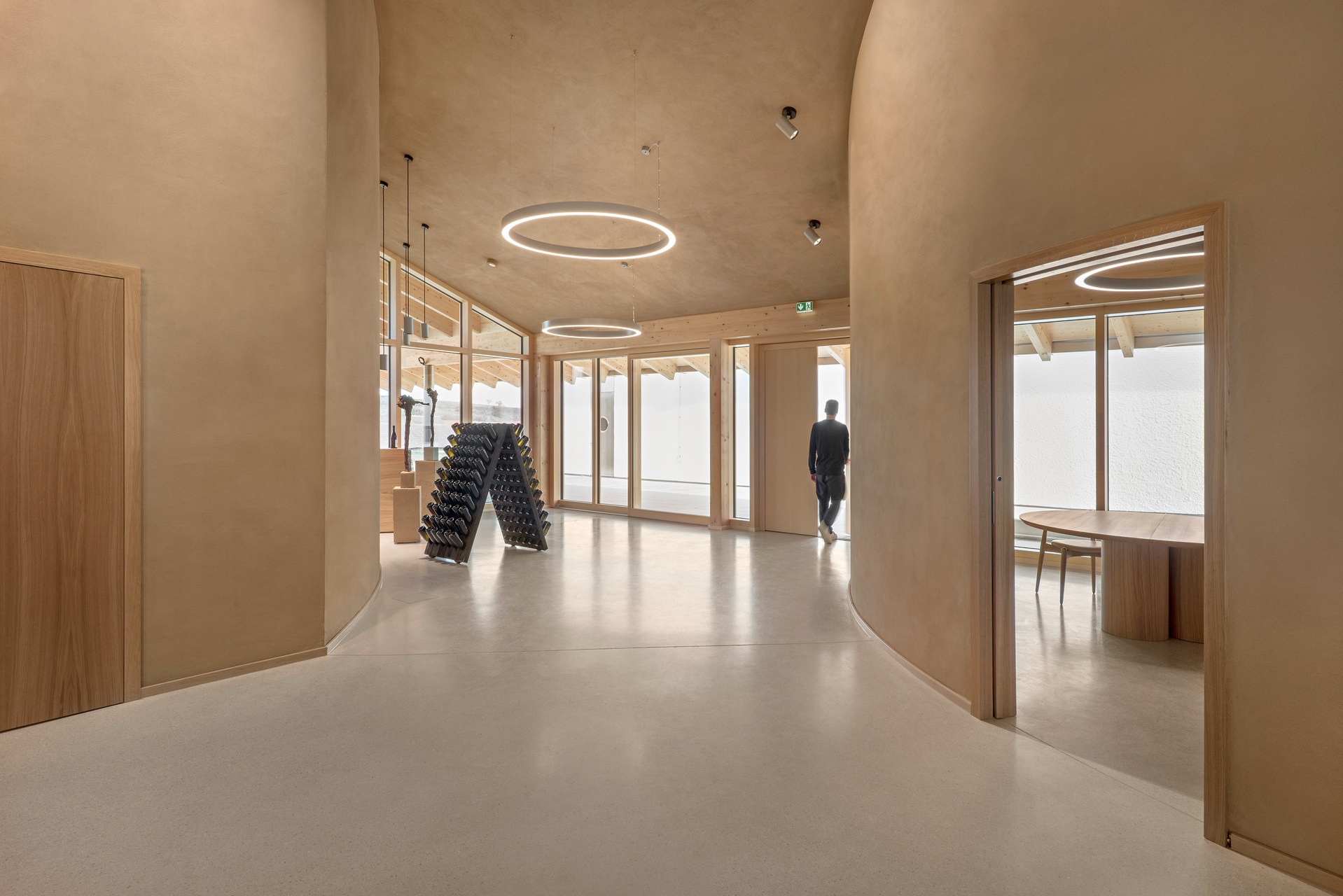 In den oberen Bereichen sorgen Holz und Lehm für ein behagliches Klima. Architektonische Details wie das Rundbögen-Geländer der Terrasse stellen eine Verbindung zwischen Weingut und Landschaft her. Die 2 m breite Dach-Auskragung über dem umlaufenden Weg dient als Sonnenschutz und lenkt den Blick von innen gezielt auf die Landschaft. Die Verwendung von geworfenem Kalkputz würdigt die traditionellen Kalkfassaden regionaler Presshäuser.