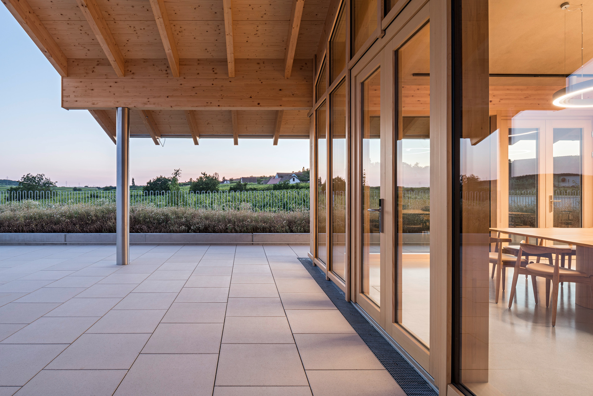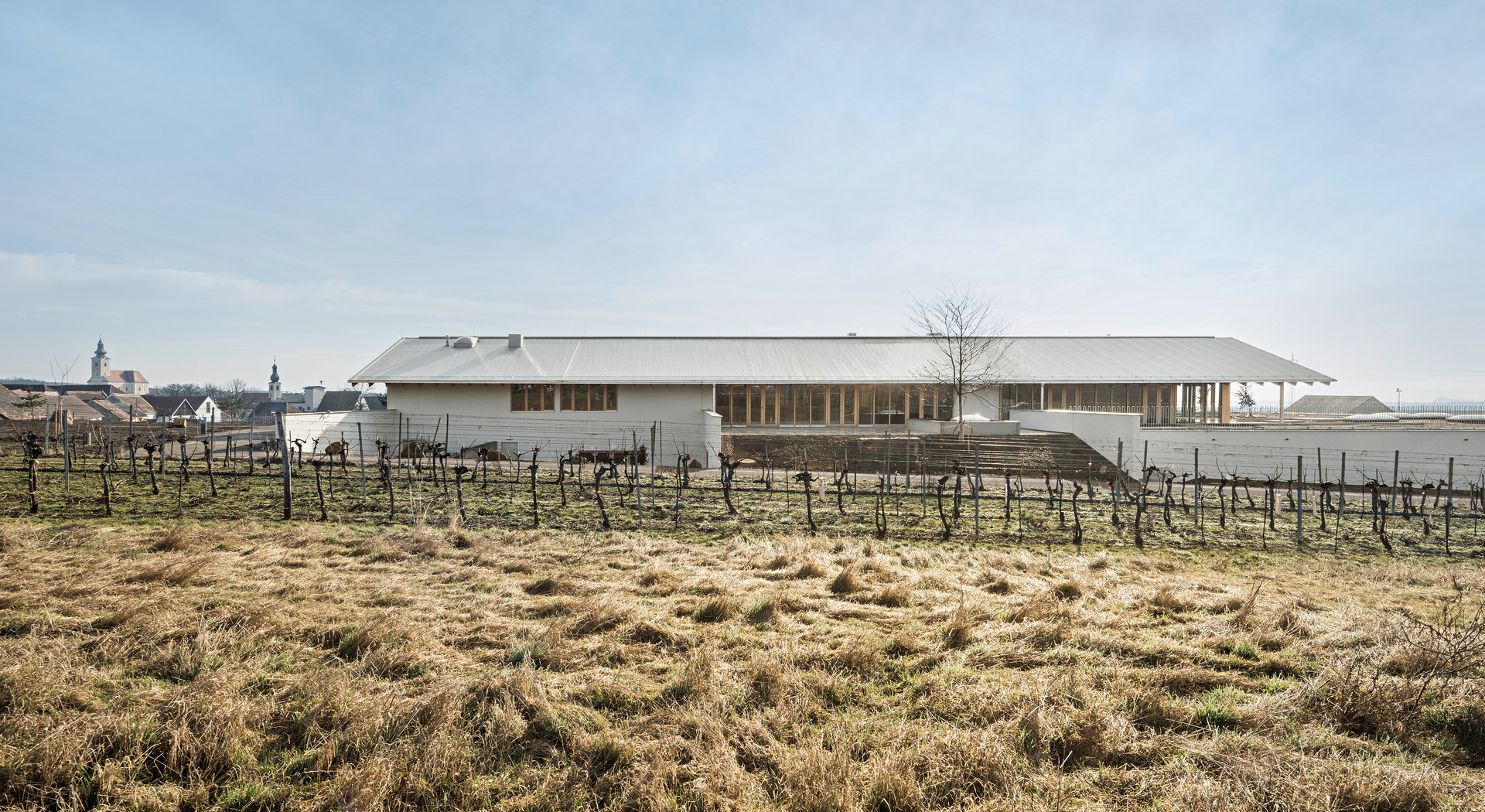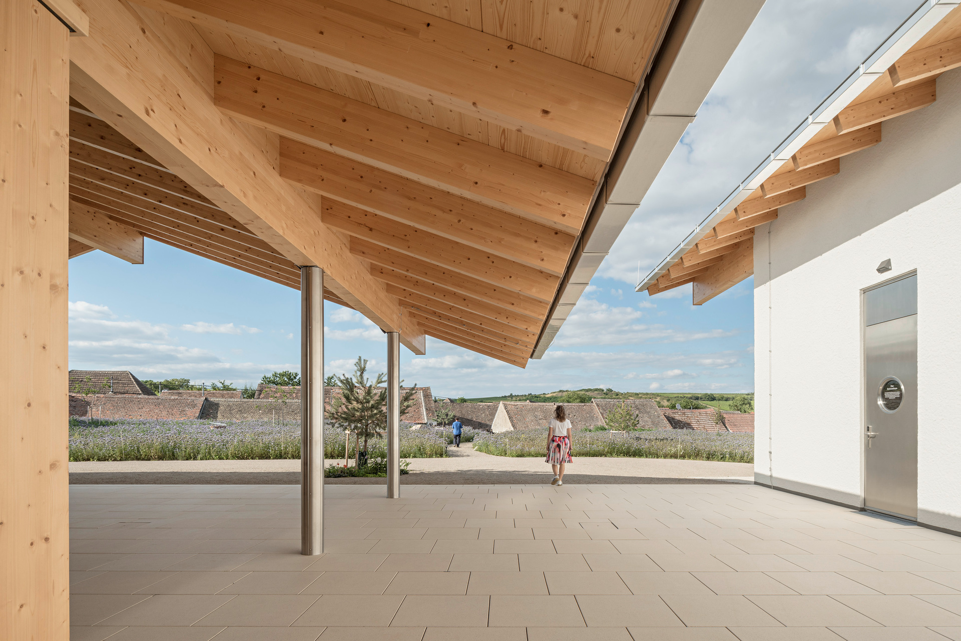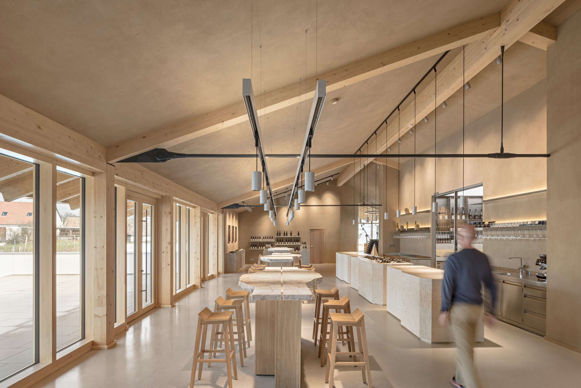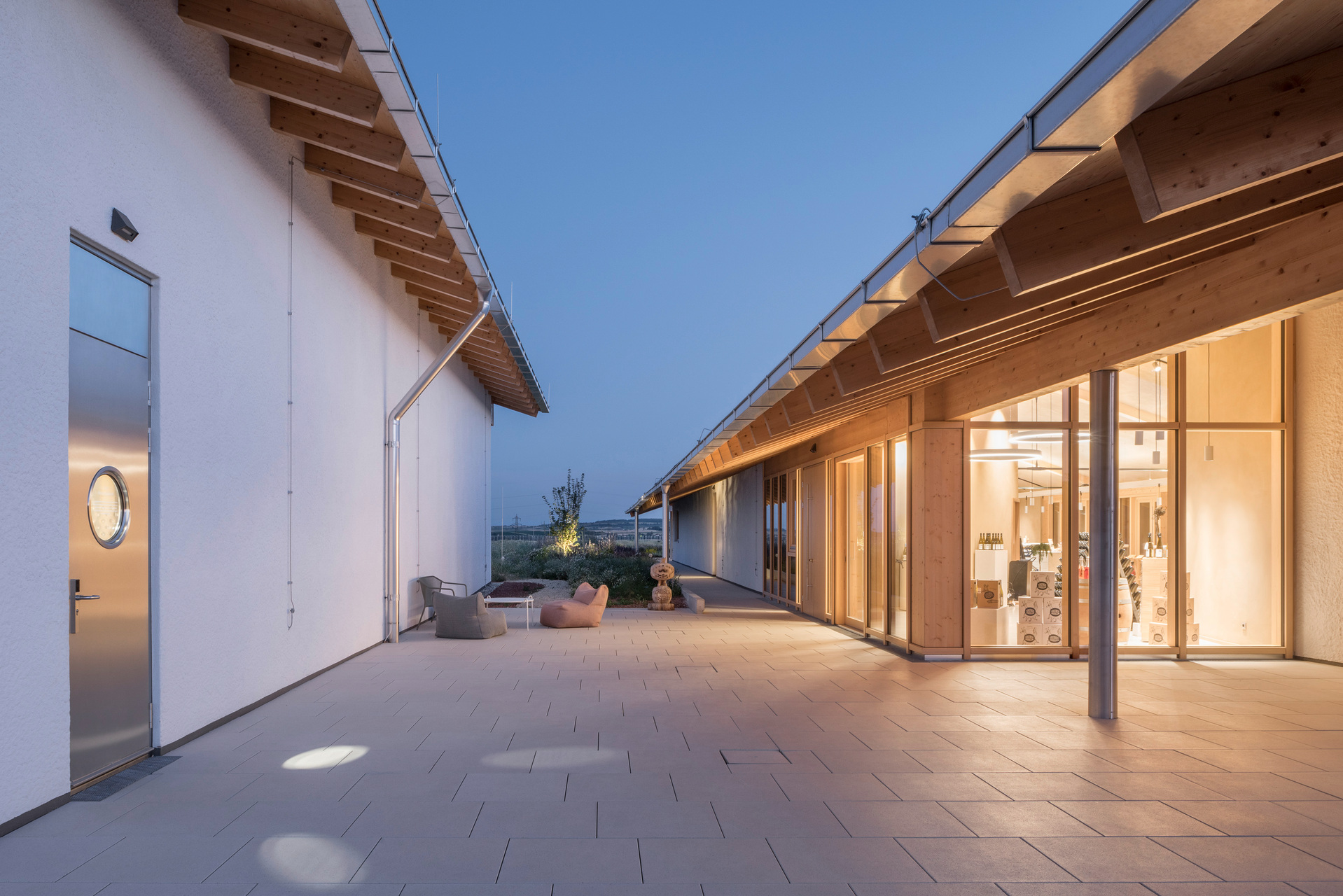 In den oberen Bereichen sorgen Holz und Lehm für ein behagliches Klima. Architektonische Details wie das Rundbögen-Geländer der Terrasse stellen eine Verbindung zwischen Weingut und Landschaft her. Die 2 m breite Dach-Auskragung über dem umlaufenden Weg dient als Sonnenschutz und lenkt den Blick von innen gezielt auf die Landschaft. Die Verwendung von geworfenem Kalkputz würdigt die traditionellen Kalkfassaden regionaler Presshäuser.