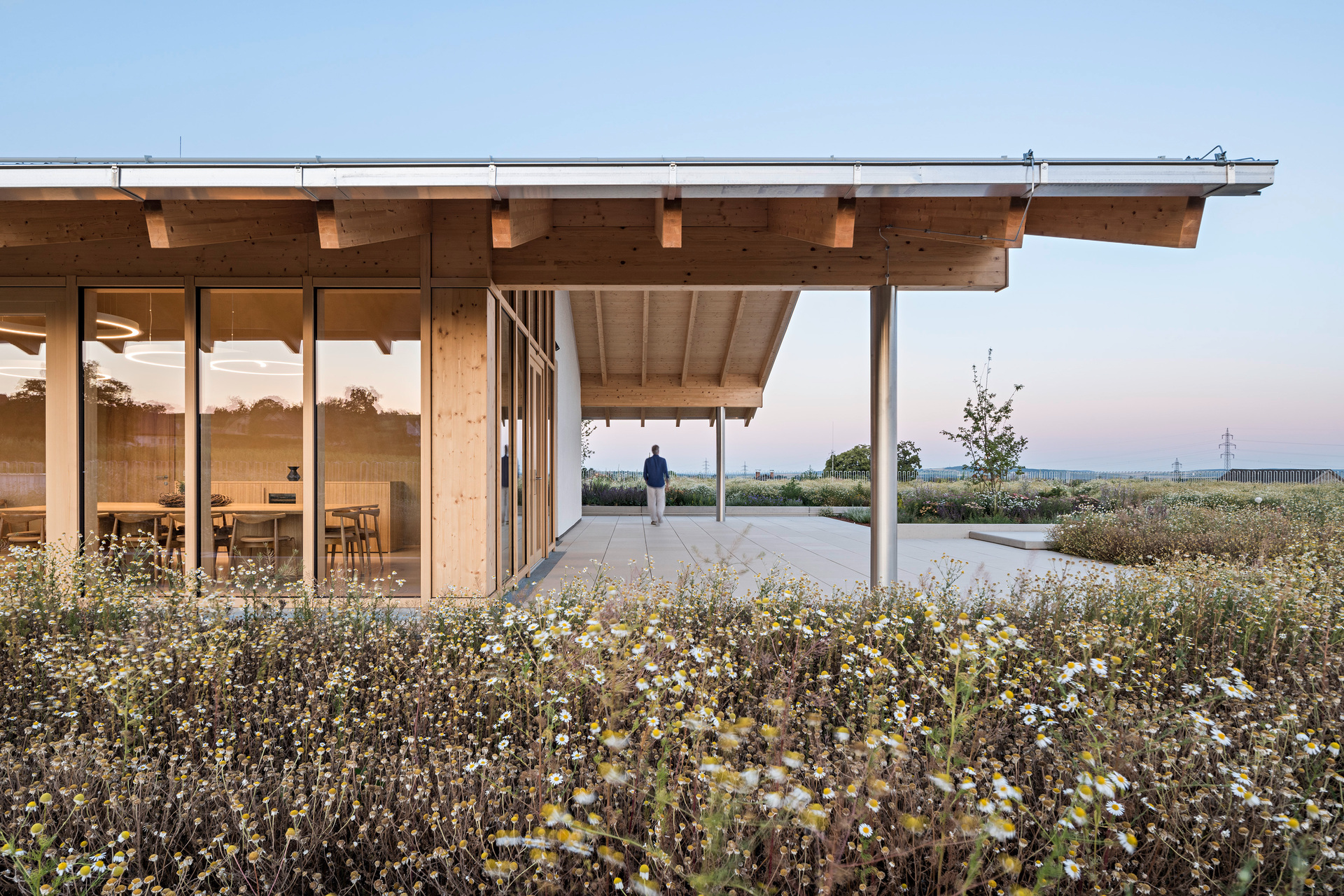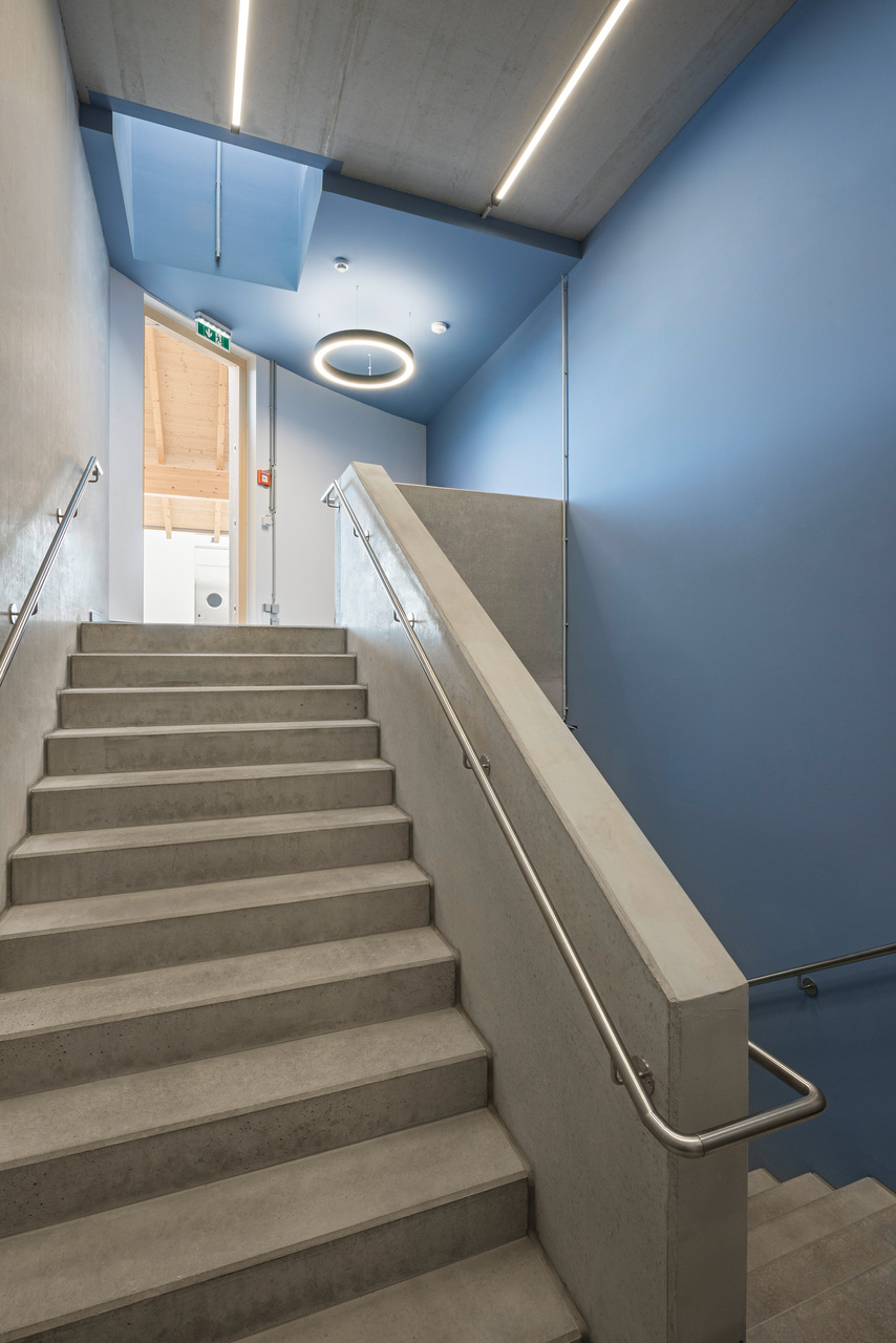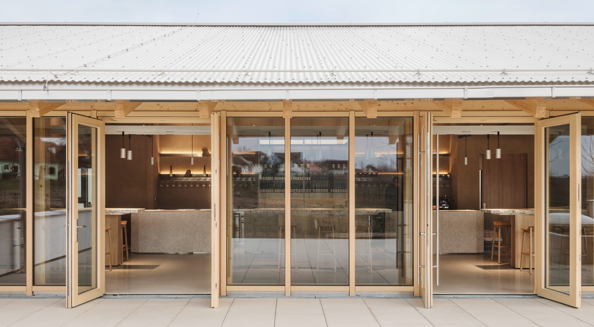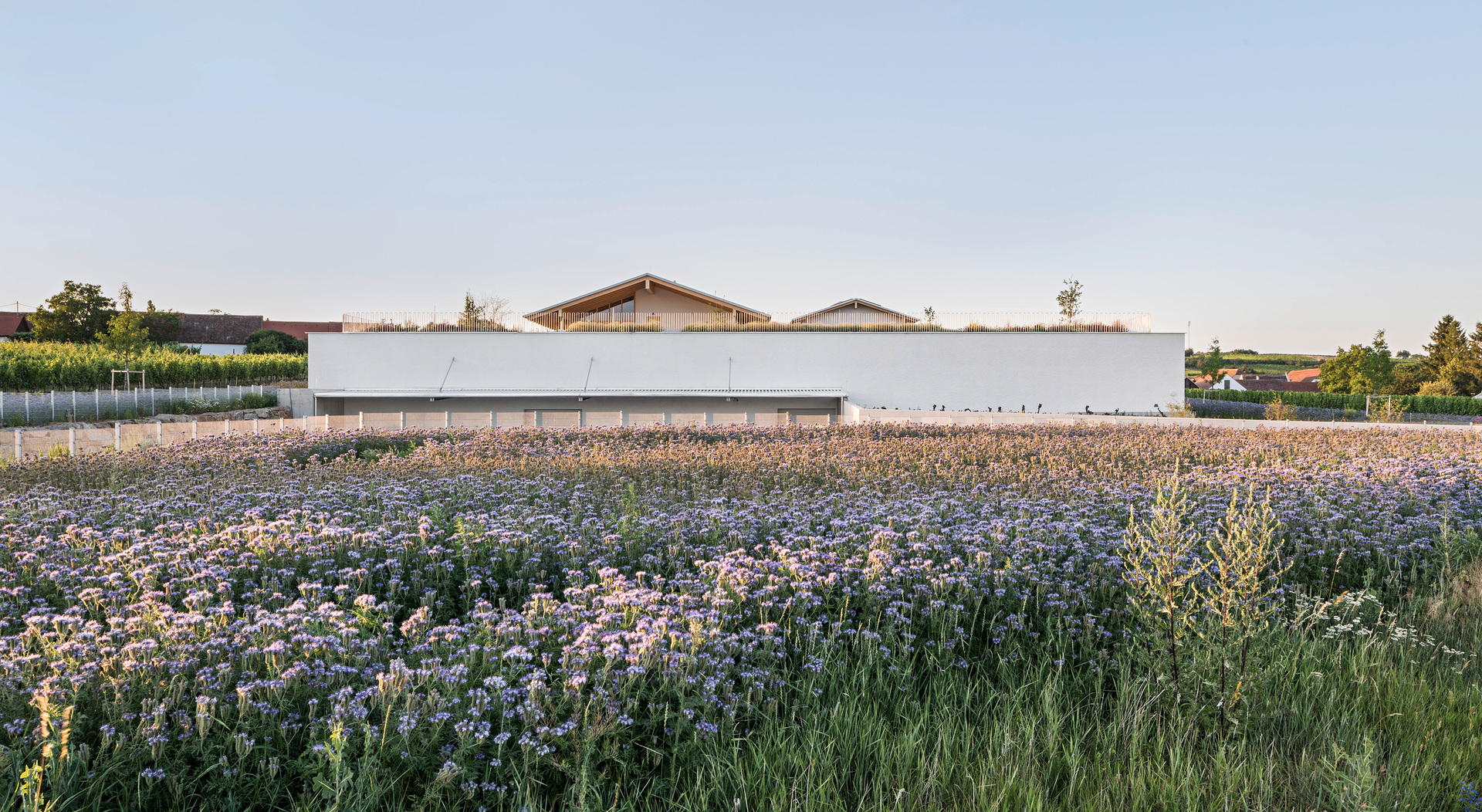 In den oberen Bereichen sorgen Holz und Lehm für ein behagliches Klima. Architektonische Details wie das Rundbögen-Geländer der Terrasse stellen eine Verbindung zwischen Weingut und Landschaft her. Die 2 m breite Dach-Auskragung über dem umlaufenden Weg dient als Sonnenschutz und lenkt den Blick von innen gezielt auf die Landschaft. Die Verwendung von geworfenem Kalkputz würdigt die traditionellen Kalkfassaden regionaler Presshäuser.