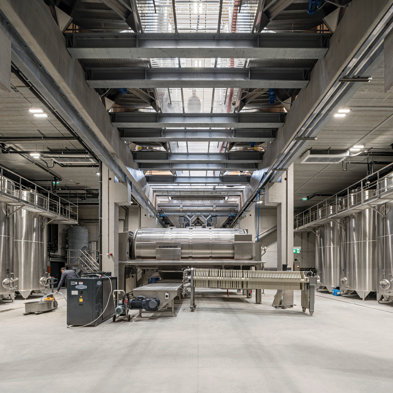 Die Produktionshalle liegt bis zu 8 m tief in der Erde. Sie ist mit den alten Kelleröhren verbunden und weist das ganze Jahr über die konstante Temperatur eines traditionellen Kellers auf. Von der Presse über die Fahrwanne zur Traubenannahme, bis zum Rotweintank und weiter bis zum Dach liegen rund 15 m Höhenunterschied. Ein offener Raum bietet freie Sicht auf die High-End-Produktion in einer innovativen Anlage, die es in dieser Form weltweit bisher nur zwei mal gibt.