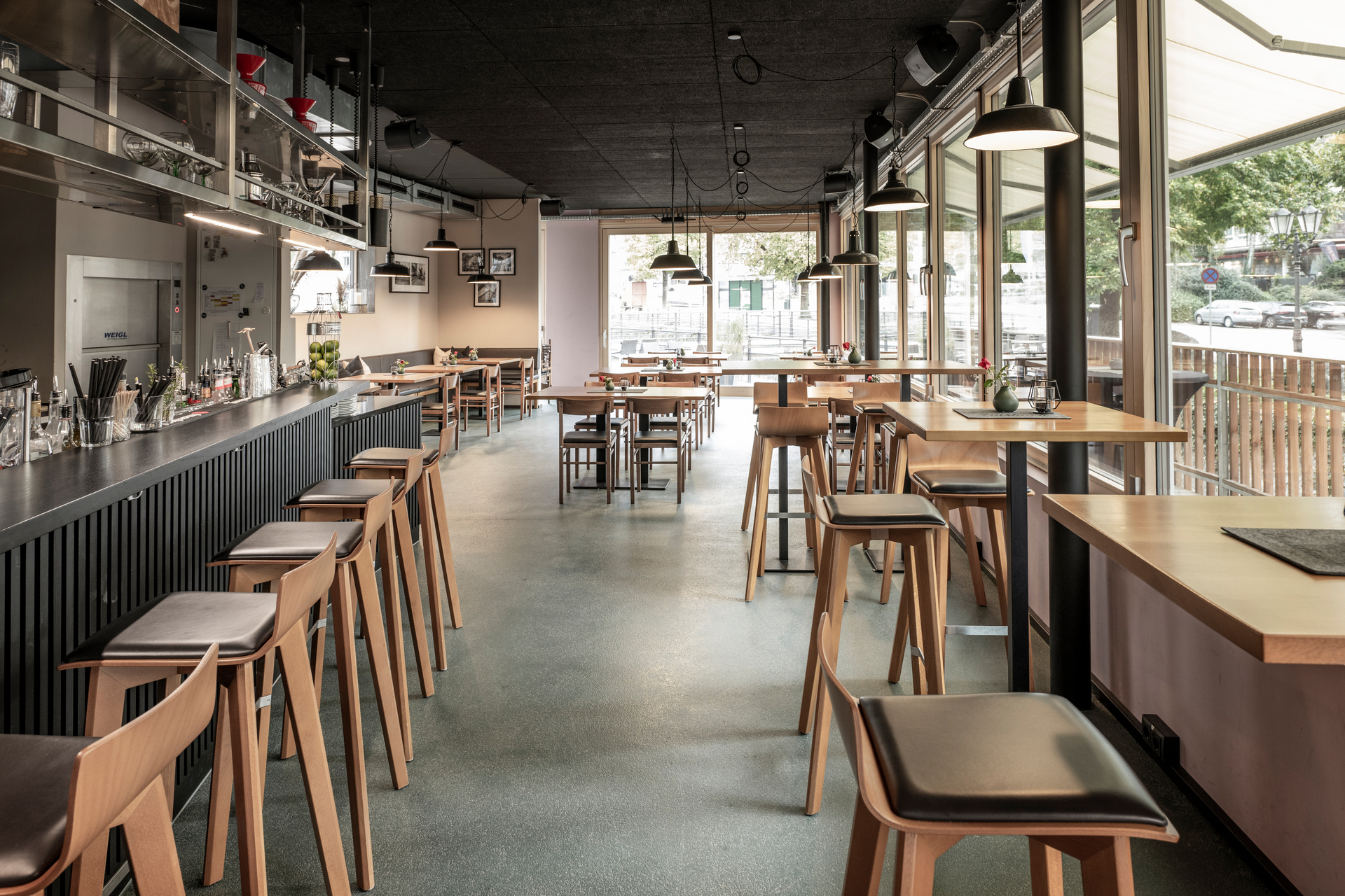 Gastraum und Bar im Ergeschoss öffnen sich großflächig zu Platz und Fluss. Eine abgeschliffene Mauerkante markiert das Gebäudeeck an der Mühlgasse, wo man das Lokal in einer kleinen Nische betritt. Eine Hälfte der Verglasung ist Schiebetür, sodass man gleich auf die Terrasse kann, die sich weiter am Fluss entlang zieht und mit den ersten Sonnenstrahlen gestürmt wird. Auch im Lokal kann man über die gesamte Länge an hohen Scheiben, sitzen und den Wellen hinterher sehen.