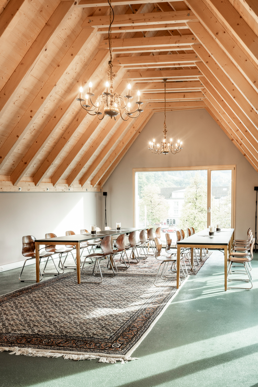 Auch die Küche im ersten Stock hat vier Fenster, eines direkt über dem Schlossplatz. Am nödlichsten Spitz des Hauses schraubt sich eine Treppe um den gläsernen Lift in der Mitte: so ist auch der große, atmosphärische Gastraum unter der faszinierenden Holzkonstruktion des Daches barrierefrei zu erreichen. An den Querbalken hängen sehr schlichte Kronleuchter, auf dem beschichteten Estrich liegt ein Perserteppich und durch das große Fenster an der Stirnseite schwebt man gleichermaßen über den Schlossplatz. (Text: Isabella Marboe)