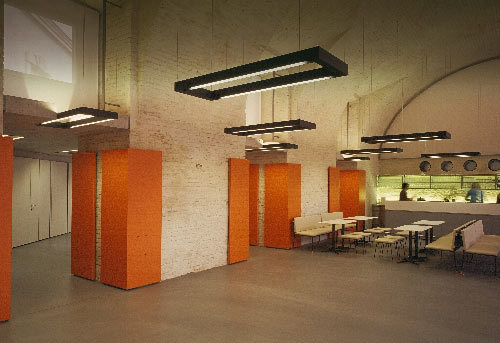 In den Zwischenräumen und im Zwischengeschoß sind die Funktionsräume untergebracht. Als missing link dient ein Verbindungsbau zwischen großem Saal und Foyer. Alt und Neu wurden miteinander vernäht. Die Naht besteht aus Licht: Streifenförmige Oberlichter im Verbindungsbau finden ihre Fortsetzung in den Beleuchtungskörpern des Ziegelfoyers.