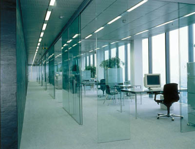 Im Spannungsfeld zwischen Kern und Hülle wurden die flexiblen, offenen und transparenten Büroflächen situiert. Dabei wurde eine Kombination aus einer Großraum- und einer transparenten, flexiblen Zellenstruktur gewählt, um der Dynamik eines innovativen, zukunftsorientierten Unternehmens Rechnung zu tragen. Analog dazu wurde die Arbeitsplatzmöblierung auf simple, rechteckige Arbeitsflächen reduziert, um auf die sich ständig im Wandel befindende, computerunterstützte Informationstechnologie flexibel reagieren zu können.