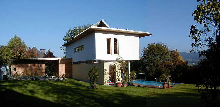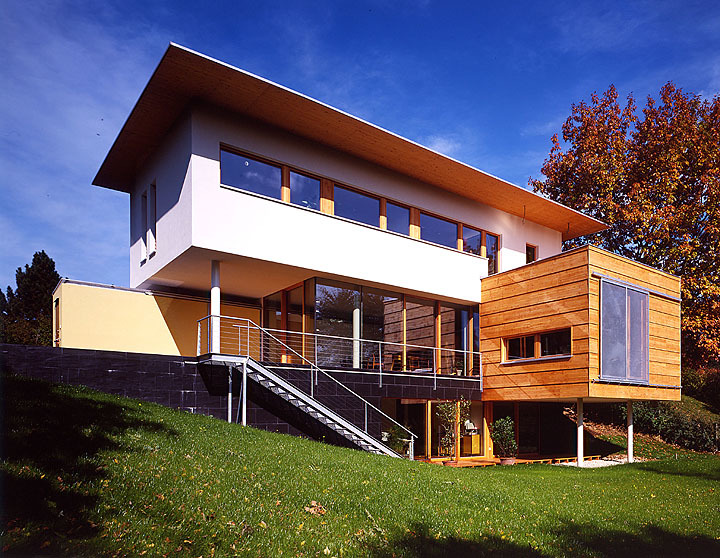 Der Hauptbaukörper liegt parallel zum Hang, der übrigens kaum verändert wurde. Ein Riegel aus vorgefertigten Holzpaneelen führt im rechten Winkel dazu als Garagen-und Eingangsbau ins Haus und kragt nach Süden als aufgestelzter Würfel, in dem das Wohnzimmer untergebracht ist, aus. Das an drei Seiten im Erdreich eingegrabene Untergeschoß gewinnt an der Gartenseite viel Tageslicht durch die großen Verglasungen. Die massiven Wandflächen sind mit Schiefer verkleidet, der erstens für optische Bodenhaftung sorgt und zweitens gleichsam als „Bratpfanne“ Sonnenwärme speichert.