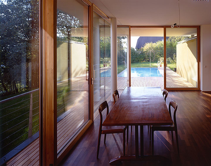 Das Geschoß darüber wird hauptsächlich vom großen Esszimmer eingenommen, das nach Süden und Westen verglast ist und über große Schiebetüren in die schwellenfrei anschließende Terrasse übergeht. Zu den verglasten Schiebetüren ist anzumerken, dass nicht nur die Gläser modernsten Anforderungen hinsichtlich eines niedrigen Wärmedurchgangswertes entsprechen, sondern auch die in Lärche ausgeführten Profile mit einer vier Zentimeter starken Korkeinlage gedämmt sind. Nur deshalb konnten die in Passivhäusern sonst eher gemiedene Offenheit und Öffnungsmöglichkeiten ohne nennenswerte Energieverluste realisiert werden.