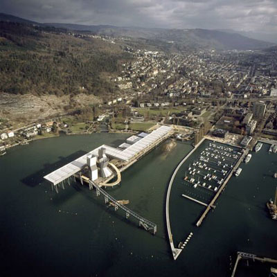 Der Aufwand, der bei der sechsten Schweizerischen Landesausstellung betrieben wird ist tatsächlich beträchtlich. An drei Seen, in vier Städten wurden imposante, mit drei Dutzend zum Teil technisch äußerst aufwendigen Ausstellungen bestückte Arteplages aus dem Boden gestampft. Eine Ausstellungsfläche von 475.000 Quadratmetern, das entspricht 70 Fußballfeldern, soll den Publikumserfolg garantieren. Dazu kommt eine raffiniert umgebaute Barke als weiterer „Kunststrand“, Funparks und 1.500 Veranstaltungen mit 10.000 Aufführungen. Die Expo dauert 159 Tage, vom 15. 5 bis zum 20. 10., im Winter dieses Jahres werden dann all die spektakulären Bauten wieder verschwunden sein. Abbau und Widerverwertung der nach dem Prinzip der Nachhaltigkeit verwendeten Materialien waren feste Bestandteile der Planung und des Budgets, die technische Direktion spricht von „Prerecycling“. So richtet sich zum Beispiel das Ausmaß der Plattform in Biel nach den Standardgrößen der verwendeten Stahlträger. Diese sind lediglich ausgeliehen und werden im November, weder von Bohrlöchern noch von Schweißnähten verletzt, vom Hersteller zurückgenommen. Die Pfähle, auf denen die Träger ruhen, sind bereits zum zweiten Mal im Einsatz, in ihrem ersten Leben waren sie tschechische Heizungsrohre.