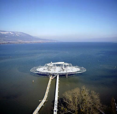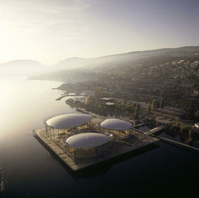 Ich mache mich auf den Weg zur Arteplage in Neuchatel. „Nächster Zug in 4 Minuten und 5 Sekunden“, eine etwas übertriebene Präzision, denkt man sich, die Anzeigetafel zum neu gebauten Zahnradbähnchen lesend, das den Bahnhof Neuchatel direkt mit der Arteplage verbindet. Blickfänger der von dem französich-schweizerischen Architektenteam „Multipack“ konzipierten Arteplage sind drei in 30 Meter Höhe schwebende, an UFO's gemahnende „Galets“ (Ufersteine) mit einem Durchmesser von über 100 Metern. Unternehmen wie Novartis, die Vereinigung Westschweizer Wasserwerke oder die ETH Zürich, variieren hier das Thema „Natur und Künstlichkeit“.