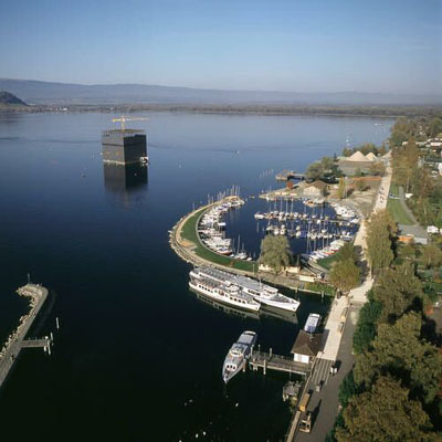 Die Hauptattraktion von Murten ist ohne Zweifel der vom Pariser Architekten Jean Nouvel geschaffene gigantische Monolith, ein merkwürdiges, rostiges, 3900 Tonnen schweres Mausoleum. Das Beste aber: Er schwimmt. Dass er dies tut verdankt er seiner spektakulären Konstruktion und der Plattform, auf welcher der Kubus (34 Meter hoch breit und tief) steht. 100 Betonhohlkörper, jeder von der Größe eines Zimmers, sorgen für den nötigen Auftrieb. Die Schweiz wäre nicht die Schweiz, würde nicht auf eine lückenlose Exekution der Gesetze gepocht. Obwohl im See vertäut, gilt der Monolith vor dem Gesetzt als Schiff, muss also mit Nummernschilder, Rettungsbooten sowie einem Kapitän bestückt werden.