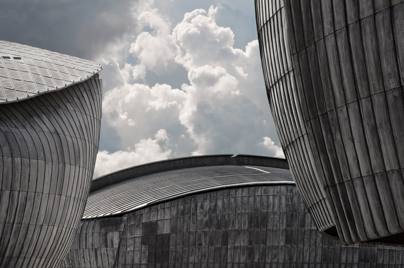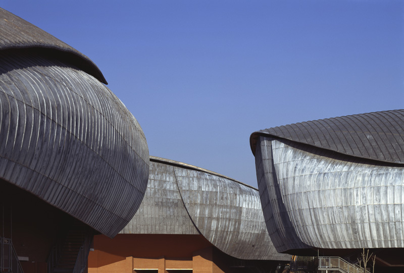 Jetzt ist der «Parco della musica» Realität; kurz vor Weihnachten 2002 wurde der letzte Teil eröffnet. Da stehen sie nun, die drei Skarabäen, wie die Konzertsäle im Römer Volksmund bereits getauft sind. Tatsächlich gleichen sie drei überdimensionierten Käfern; im Halbkreis kauern sie, um neunzig Grad voneinander abgedreht, um ein zentrales Amphitheater - links, sozusagen auf Position neun des Zifferblattes, der grosse Saal, im Mittag der mittlere, rechts der kleine, dazwischen die archäologischen Reste und eine kleine (auch etwas belanglose) Präsentation wertvoller Musikinstrumente aus der Sammlung der Santa Cecilia. Verbunden sind die drei Gebäude durch ein an ihren Stirnseiten umlaufendes, durchgehendes Foyer. Man betritt es, um beim Bild des Zifferblattes zu bleiben, auf Position vier, wo sich ein grosses Dienstgebäude befindet: mit der Verwaltung und dem Archiv der Santa Cecilia, ihrer reichen Bibliothek und einer noch aufzubauenden Mediathek, mit Restaurant und Café, Billettkasse und Buchhandlung. Einen äusseren Ring um die Anlage bilden zwei in den Boden versenkte Stockwerke, welche die Garderoben und nicht weniger als fünf Probesäle verschiedener Grösse enthalten.