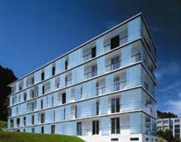 Der Ausbau ist einfach und funktional. Ein schönes Detail: In die Schicht mit den Nasszellen sind begehbare Schränke eingepasst. Die tragenden Böden und Decken liegen auf den Aussenwänden und auf dem Erschliessungskern auf, was erlaubt, die Wohnfläche ohne Probleme in ein Loft oder in eine Fünf-Zimmer-Wohnung einzuteilen. Man kann Zimmerwände einziehen oder weglassen, je nach Bedarf. Matte, geschosshohe Glasscheiben hüllen den Kubus wie eine zweite Haut ein. Sie schützen die grosszügige Balkonzone vor Wind, Wetter und Blicken. Durch die leichte Verschiebbarkeit der Gläser verändern die Bewohner das Bild der Gebäude ständig.