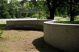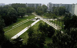 Diese sollen zum Aufenthalt im Schatten der neuen Bäume einladen, doch es scheint, als würden die Bewohner die weiten, teilweise sanft modellierten Rasenflächen zum Picknick und für Feste bevorzugen. In diesen Flächen findet man immer wieder grossformatige Betonplatten als Markierung der offenen Enden jenes zerrissenen Wegnetzes, das die Wohngebäude vor ihrer Zerstörung erschloss. Nach der Vorstellung der Gestalter soll in der Blumenwiese das Muster der Wohnwege durch gezieltes Mähen zwischen den Betonplatten wieder sichtbar werden.