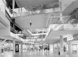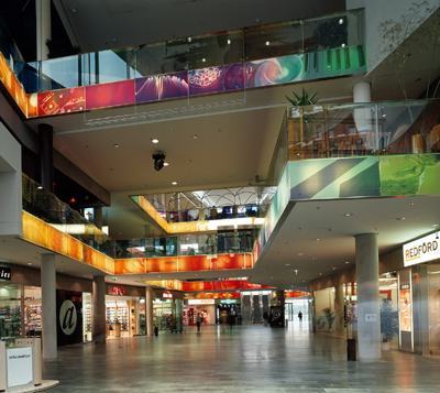 G eschäfte, Gastronomieeinrichtungen und Spielmöglichkeiten säumen die eigentliche, dreigeschoßige Mall, in welche die Besucher nun hereingezogen werden. Rundherum führende, in der Höhe versetzte Galerien versprechen weitere Attraktionen und locken hinauf in die oberen Geschoße, zu denen Rolltreppen hochführen. Daß nicht alle Inneneinrichtungen das Qualitätsniveau einhalten, liegt in der Natur derartiger oft kurzlebiger Einrichtungen. Mit den durchgehenden Bändern vor den Deckenstirnen bringt Lainer ausreichend Ordnung in die flutenden Raumfolgen, deren Lufträume er mit Ste- gen und Stiegen durchstößt, auf denen sich sein Gespür für Raum, ja seine Raumlust und positive Haltung zu Lebensfreude nachvollziehen lassen.