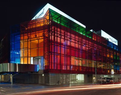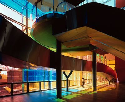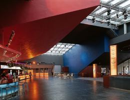 Für jene, die nicht aus den Liften von den Garagen kommen, gibt es zwei Zugänge: Erstens eine lange, geschlängelte Rampe, die am Gehsteig beginnt, nach zwei Kehren ins Bauwerk eindringt und entlang der farbigen Glaswand ansteigt, tiefe Einblicke in die Foyers vor den Kinosälen bietet und in die Halle vor dem Entertainmentbereich mündet. Zweitens eine Brücke, die aus der - na ja - Gasometer-Mall herüberführt, deren Seitenflächen und Decke verglast sind und die ebenfalls in die oben genannte Vorhalle hineinzielt. Die Lagegunst nutzt eine langgezogene Café-und- Bar-Installation, ein zeitgemäßer Schanigarten auf der Brücke für das Sehen-und-Gesehenwerden.