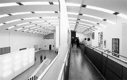 Ein thematisch naheliegendes Beispiel von veech.media.architecture. ist die Gestaltung der Ausstellung „Televisions - Kunst sieht fern“ in der Kunsthalle Wien, die Anfang Jänner zu Ende ging. Um die Kunst-betrachter näher an die Fernsehkunst heranzubringen, bedurfte es in der schwierig zu bespielenden Halle 1 eines prägenden architektonischen Eingriffs: Die Veechs nutzten den hohen, mit einer Tonne gedeckten Raum aus, indem sie eine mit Projek-tionsfolie bespannte Gerüstkonstruktion hineinstellten, die ei- nerseits die zwei Galerien an den Breitseiten der Halle durch einen Steg verband, andererseits als den Raum längs strukturierendes Element wirkte. Durch Ausschnitte im fast raumhohen Screen wurde der Blick in den Ausstellungsraum beziehungsweise auf die einzelnen vorgehängten Wände mit Kunstwerken freigegeben, von der unteren Ebene betrachtet schufen die über den Steg spazierenden Menschen ein „bewegtes Bild am Schirm“. Der Einbau der Brücke intendierte, eine Fluktuation durch die Ausstellung herbeizuführen, gleichzeitig wur- de der ganze Raum für die Besucher aktiviert, da sich von der Brücke aus neue räumliche Perspektiven erschlossen.