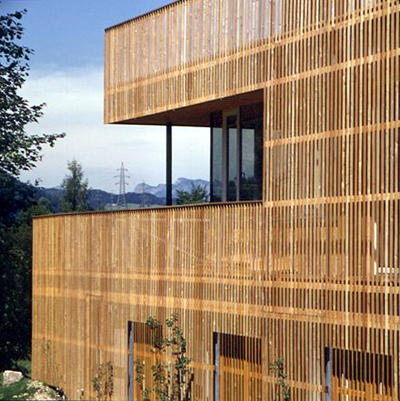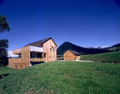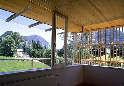 Die konstruktive Ausführung erfolgte in vorgefertigter Holztafelbauweise mit brettverleimten Massivholzdecken. An der Südfassade ist eine zweite Haut in Form eines Rankgerüstes hochgezogen, sowohl als Sichtschutz als auch als Schattenspender für die Terasse und die Wohnräume. Sehr behutsam wurden die Öffnungen als Aussichtsfenster in die Wände geschnitten. Die veredelten Proportionen und die grossen Öffnungen lassen bereits von weitem die moderne Bauweise erkennen und auf die offenen Grundrisse schließen. (07.05.2001)