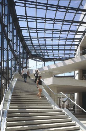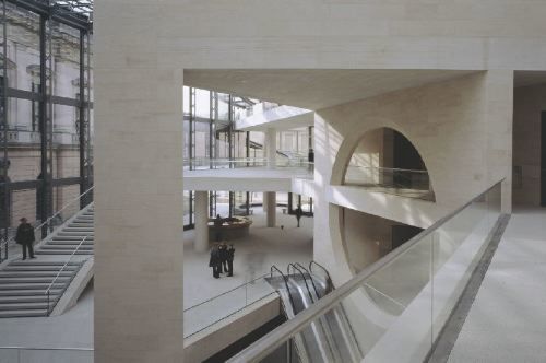 Durch die gläserne, bogenförmige Fassade gen Süden wird das riesige Foyer von Licht durchflutet; den in strenger Klarheit eingesetzten Materialien Kalkstein, Granit und eingefärbter Beton verleiht dies eine haptische, sinnliche Ausstrahlung. Pei vermeidet jede Historisierung, erweist aber mit Ausblicken seinem architektonischen Ahnen Schinkel die Reverenz - und vor allem dem Zeughaus. Die Nordseite des DHM-Stammhauses mit den Plastiken von Schlüter darf, von Peis gläsernem Foyer aus betrachtet, einer Schaufassade gleich auftrumpfen. Allerdings hat Pei Schinkels Maxime, wonach ein Museum «erst erfreuen und dann belehren» soll, derart hochgehalten, dass seine effektvolle Inszenierung in Gestalt des zweckfreien Foyers rund die Hälfte der Gesamtfläche in Anspruch nimmt. Die Enge der vier Ausstellungsetagen, die 2500 Quadratmeter umfassen, dürften in Zukunft sowohl die Kuratoren der Wechselausstellungen wie die Besucher noch zu spüren bekommen.