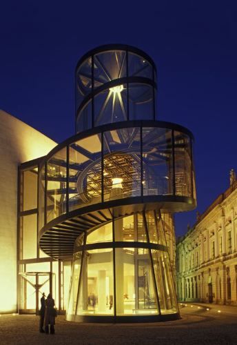 Weniger Altersmilde hätte man sich bei Peis gläserner Treppenspindel gewünscht, die sich in einem ersten Entwurf geschlossener zeigte. Nun kragt - weniger nüchtern und auf den ersten Blick wohl gefälliger - eine Treppenwindung als fette Wulst aus dem Zylinder, weshalb der Berliner Volksmund in seiner liebenswürdigen Art die Glaswindung bereits zur «Schnecke» gemacht hat. Würde allerdings manch anderes bedächtig und ruhig wie sie seiner Vollendung entgegengleiten, wäre aus der deutschen Hauptstadt wieder so etwas wie Bewegung zu vermelden.