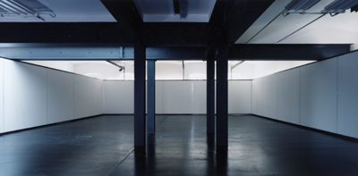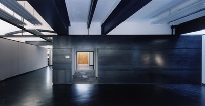 Die schwenkbaren Ausstellungswände bieten sehr gute Hängemöglichkeiten und ausreichenden Platz für die Versorgung mit den notwendigen Medien und können zudem den Raum auch rasch verändern. Dahinter verborgen liegen die Stau- und Nebenräume, sowie die Garderoben, die Toiletten und die Teeküche. Die Wandverkleidung zieht sich auch über den Bereich des Haupteinganges und der Kasse. Die in die ständige Ausstellung führende Treppe bleibt von den massiven Wänden des Bestandes umschlossen. Die Wände sind mit rohem Blech verkleidet und geben gemeinsam mit dem Tragwerk dem Haus eine Anmutung, die an die Zeit der Schmieden und Hammerwerke erinnert. (02.04.2001)