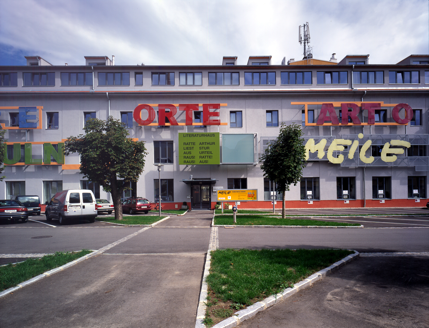 Eine Projektionsfläche im Bereich des Haupteingangs dient einerseits zur Ankündigung von Veranstaltungen, andererseits zur Vermittlung von literarischen Texten durch das Unabhängige Literaturhaus.
