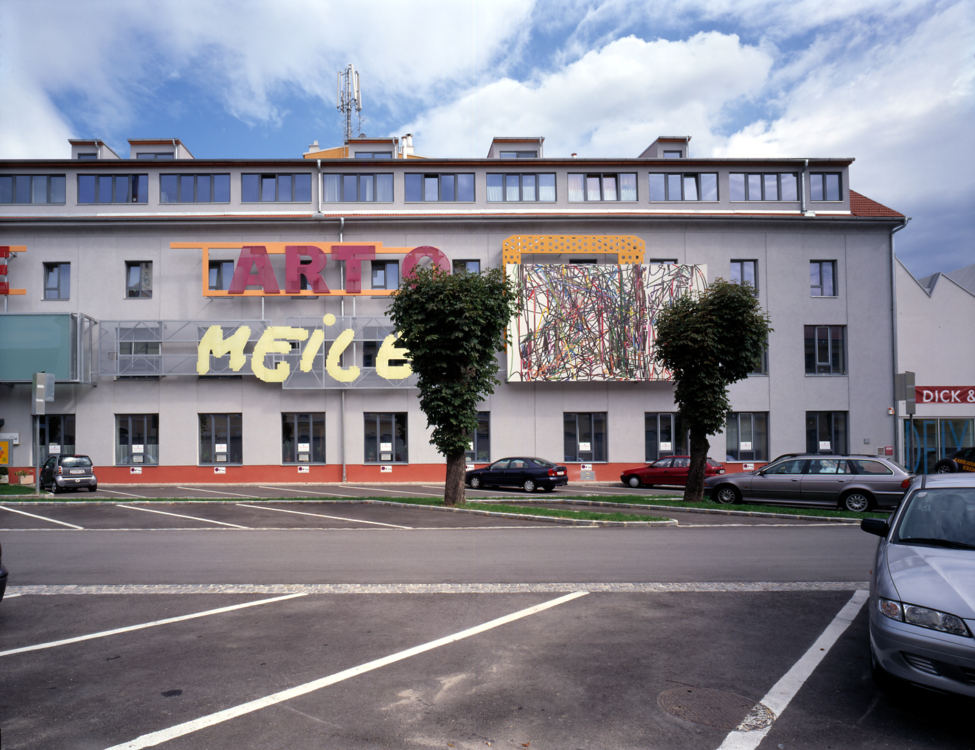 Der neue Begriff der „Kunstmeile Krems“, der das Label für Kunsthalle, Karikaturmuseum und die genannten Institutionen in der Eyblfabrik bildet, wurde ebenfalls transformiert und mit dem Schriftzug „Meile“ dargestellt.