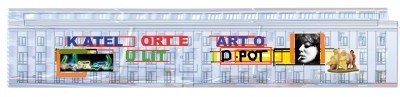 Das Haupttragegerüst besteht aus 18 mit Klebeankern an der Fassade befestigten Konsolträgern (Formrohrrahmen), an welchen die übrigen Bauteile wie Breit-, Screen-, Farb- und Schriftrahmen mit einem Abstand von 50 – 70 cm von der Fassade befestigt werden. An den Schriftrahmen wiederum werden die aus Lochblechen gefertigten und emaillierten Buchstaben , an den Screenrahmen die Bildreproduktionen und die Projektionsfläche befestigt.