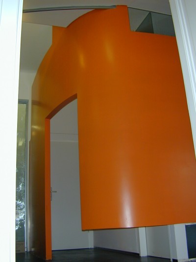 Die notwendigen Funktions- und Nebenräume wurden in eine boden- und deckenfreie skulpturale Wandplastik verpackt.