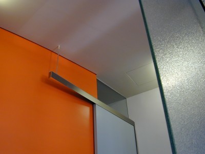 Das Hauptproblem bei der Ausführung waren die in der Tiefe liegenden unbelichteten Nebenräume. Um auch dort eine Belichtung sicherzustellen, wurde eine Zwischenwand entfernt und durch eine verschiebbare und abblendbare Glaswand ersetzt.