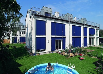 Die Siedlung in moderner, architektonisch qualitätsvoller Gestaltung fällt durch die Lösung der ausgebauten Dachgeschosse positiv auf. Das etwas asymmetrische Satteldach mit optimal für die integrierten Sonnenkollektoren nach Süden geneigten Dachflächen sowie die mit vorbewittertem Zinkblech verkleidete Trempelwand und Dachhaut geben eine Neuinterpretation der traditionellen Satteldachform.