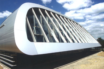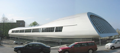 Im Jahr 1999 wurde ein Gutachterverfahren ausgeschrieben, aus dem das Projekt von Najjar & Najjar, eine röhrenförmige glänzende Struktur, die sich diagonal an die Grundstücksgrenze vorschiebt, als Sieger hervorging. Die Hülle aus Aluminium schwingt sich in einer Wellenbewegung zu einer beinahe monumentalen, schräg über zwei Geschoße angeschnittenen Öffnung zur Bundesstraße hin auf, hinter der ein Großraumbüro mit eingezogener Galerie liegt. Auf dem oberen Niveau - also innerhalb der Aluminiumhülle - sind weitere Büros angeordnet. Im fast durchgehend verglasten Erdgeschoß liegen Laborräume. Eine großzügige zentrale Halle mit Oberlicht verbindet die
