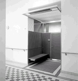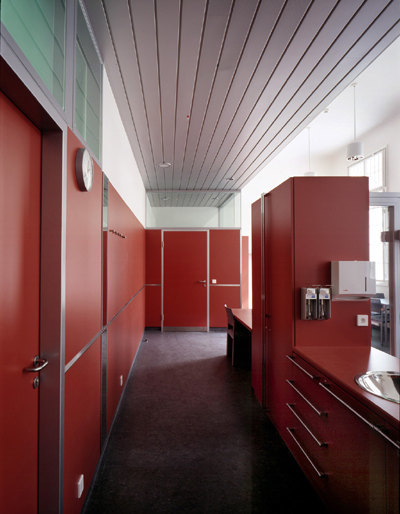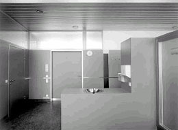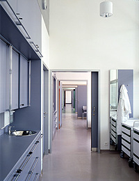 Die Längsorientierung bewirkt, daß die Zimmer weniger Tiefe brauchen, was neue räumliche Definitionen möglich macht. An den Sanitärbereichen vorbei verläßt man das Krankenzimmer, gelangt jedoch nicht direkt auf den Gang, sondern in einen Vorbereich mit halböffentlichem Charakter, was durch ein fix befestigtes Bankerl noch unterstrichen wird. So verfügt jedes Zimmer über seinen eigenen Vorraum, wobei über Oberlichten eine visuelle Anbindung hergestellt wird. Diese Entkoppelung vom hohen Raum und den weniger hohen Zwischenwänden läßt die Einbauten wie hineingestelltes Mobiliar wirken. Gleichzeitig wird der Gang durch die Rücksprünge, die sowohl in der Bodengestaltung als auch durch abgehängte, auskragende Deckenelemente aus Aluminium betont werden, in seiner Länge entschärft. Zwischen den „Vorplätzen“ liegen Versorgungsräume, über dieser Zone verläuft entlang der Längsachse der Technikkollektor mit sämtlichen Ver- und Entsorgungsleitungen.