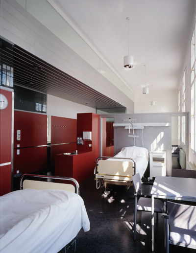 Über die bereits beschriebenen Zonierungen hinaus war die räumlich-funktionale Organisation der einzelnen Stationen an der Achsialität des Baubestandes so gut festzumachen, daß sie ganz selbstverständlich wirkt: Gegenüber dem mittig an der Nordseite des Baukörpers liegenden Stiegenhaus mit direktem Blick auf den Eingang liegt der jeweilige Stationsstützpunkt, an der Südostecke mit Ausgang auf die Loggia der Patientenaufenthaltsraum. Jedes Stockwerk ist durch eine spezifische Farbe der eingebauten Möbel und Wandpaneele kenntlich gemacht, alle Details sind durchgeplant und in hochwertigen Materialien ausgeführt - und vor allem: Alt und Neu gehen, wie meistens, wenn gute, sensible Architekten oder Architektinnen mit der Planung beauftragt werden, einander bedingend und ergänzend bestens zusammen.