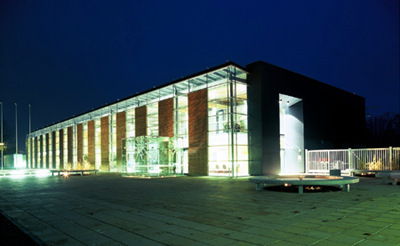 Auch der Vorplatz wurde neu gestaltet. Die kreisrunden Pflanzinseln, die durch ihre Bepflanzung mit Gräsern differenziert sind besitzen zum Teil Einfassungen in Sitzhöhe und bieten Sitz- und Wartemöglichkeiten beim Zugang zum Freibad. In der Nacht und in den Abendstunden werden die Sitzinseln illuminiert. Ein weiteres Gestaltungselement bildet das kreisrunde Wasserbassin, es ist mit drei Fontänen ausgestattet und bietet so während der Betriebsstunden des Bades ein aktives Signal im Eingangsbereich. Der kleine Wassergarten stellt die direkte Weiterführung des Erlebnisbereichs des Hallenbads nach aussen dar und bietet ein angenehmes Ambiente zum Verweilen. (14.05.2001)