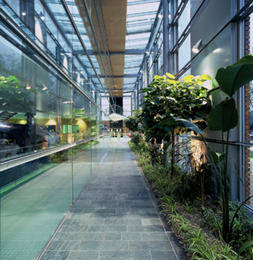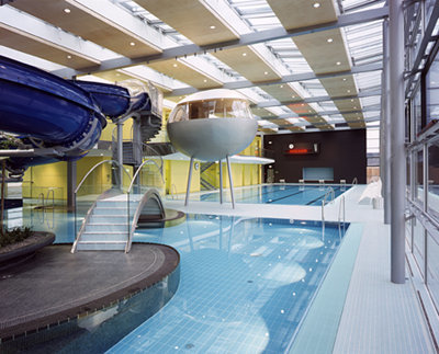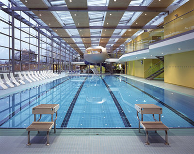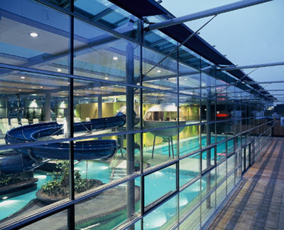 An zwei Stellen der Südfassade sind grossflächige Schiebetüren, um während der Sommermonate einen fließenden Übergang von Hallenbad zu Freibad zu eröffnen. Im 1.Obergeschoss befindet sich eine offene Galerie, für Liegen und Ruhezonen und die Gastronomieflächen beherbergt. Durch die tranparente Südfassade und die Oberlichtbänder erhält der gesamte Gastronomiebereich ein heiteres und helles Ambiente.