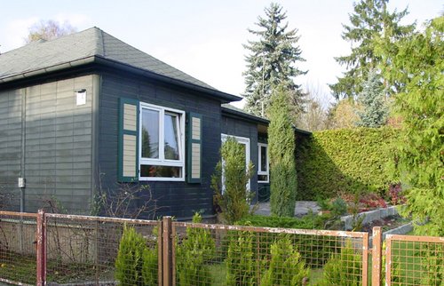 Barcode-House? Dem unbefangenen Passanten gibt sich das Gebäude kaum als solches zu erkennen. Von der Straße aus sieht er nicht viel mehr als eine silbrig glänzende Wand, besprenkelt mit schwarzen Tupfen. Eine weiche Wand bei näherer Betrachtung, in der die schwarzen Hartplastikknöpfe versinken wie Noppen in einem Polstermöbel. Was soll das sein? Ein Verpackungskunstwerk? Die Hommage eines architekturbeflissenen Chesterfield-Sofaliebhabers an das Objekt seiner Begierde? Bildeten nicht schmale Fugen in der Silberwand die Kontur eines Garagentores, man stünde vor einem Rätsel. So aber fühlt man sich ermutigt, nach einem Eingang zu suchen. An die Silberwand schließt sich links ein hoher, aus rohen Brettern dicht gefügter Zaun an, in den eine Gartenpforte eingepasst ist. Erst wer hier Einlass findet, sieht klarer.Zwei Kuben mit einem Freiraum dazwischen bilden zusammen einen langen Riegel, der sich nach Süden in den Garten erstreckt. So schlicht die Form, so kunterbunt und vielgestaltig präsentiert sich die Fassade. Silber, Rot und Schwarz, Glas, Stahl, Holz und Kunststoff, hermetisch-geschlossene und transluzente Abschnitte, schmale und breite Partien, verspielte und strenge Wandgliederungen: Zusammen ergibt das ein Streifenmuster, das an die computerlesbare Signatur erinnert, die wir von Lebensmittelpackungen kennen. Zum Garten hin offenbart es sich, das Barcode-House.