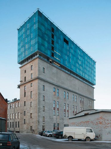 • In Tallinn (EE), KOKO architects have placed a glass box on top of the Fahle building, symbolizing its conversion from paper to lifestyle factory