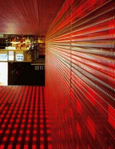 Mobilität und Nutzungsvielfalt sind aber nur zwei Charakteristika der Buden, ihre wandelbare, abends und nachts leuchtende Haut spielt eine ebenso wichtige Rolle. Spengler Wiescholek und Lützow 7 hatten bereits am Anfang der Planungen die Vision eines Platzes, der durch Lichtgestaltung lebendig wird und mit den Kiez-prägenden Leuchtreklamen korrespondiert. Zusammen mit der in einem hierfür ausgeschriebenen Wettbewerb siegreichen Arge CNWS wurde ein Konzept entwickelt, das die Buden, den Platz, die Baumhaine und die Kioske mit einbezog. Der Platz sollte sich nachts zu einem bunten, dynamischen »Urban Dancefloor« wandeln – einem großen städtischen Discoparkett, erleuchtet durch bewegliche, farbige LED-Lichtköpfe auf entlang des Platzes errichteten Mastleuchten und ebenfalls durch LEDs illuminierte Spielbuden, alles zentral von einem Rechner gesteuert. Die Wahl fiel sehr schnell auf LEDs als Leuchtmittel, weil nur diese zum einen eine lange Lebensdauer und zum anderen eine sehr gute Energiebilanz (große Lichtausbeute bei relativ niedrigem Energieverbrauch) garantieren. Mit dem farbig beleuchteten Tanzplatz wurde es dann leider aus technischen Gründen doch nichts – es gab keine RGB-Lampen mit ausreichender Lichtstärke, die in den vorgegebenen Mastleuchten Platz gefunden hätten. Weil die Leuchtstelen nun doch nur statische weiße Lichtflecken auf den Platz werfen, rückt umso mehr die Tag-Nacht-Wirkung der Spielbuden in den Vordergrund. Tagsüber wirken deren Fassaden eher geschlossen. Die Buden sind bekleidet mit einem mal schimmernden, mal reflektierenden Edelstahlgewebe, das grob genug geflochten ist, um einen Hauch von Durchblick auf das Innere der Baukörper zuzulassen und Graffiti-Attacken zu verhindern. Es ist befestigt auf einer Unterkonstruktion aus verzinkten Rechteckrohren. Hinter diesem Metallkleid nach Art von Paco Rabanne schützt eine Wetterhaut aus ESG das Innere der Bühnen.