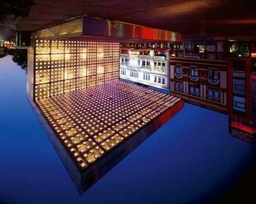 Doch ihr Potenzial schöpft die Lichtbox nur bei besonderen Events voll aus. Ebenso wie das Bauwerk ist auch seine nächtliche Beleuchtung möglichst dezent gehalten, weit entfernt vom grellen Beleuchtungsterror einer Kirmes. Eine gezielte Lichtsetzung sorgt für eine wohldosierte Inszenierung, vermittelt den Eindruck eines schwebenden, fast schwerelosen Lichtkörpers. Die Standardbeleuchtung des kalten Kristalls ist daher ein leicht gräulich schimmerndes Weiß, nur aus den Ritzen zwischen den Glasscheiben dringt helles Licht und erzeugt ein weißes Lichtgitter.
