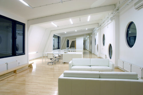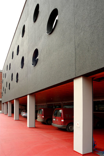 The building is located in Užice’s industrial zone between the motorway, the railway, warehouses, a football field and a cemetery. To make matters worse, the industrial zone is in the process of being transformed into a commercial centre. The only constants seem to be change and heterogeneity. How to respond to such a setting? The architects delivered what they themselves describe as „anti-design“ in reaction to the surroundings and context. Ignoring all those external factors they are powerless to change, they concentrated on the interior. The result is a building with an interesting perforated facade that reveals nothing of its interior life. What has been achieved is a very efficient spatial organization and in contrast to this programmatic severity, a rather playful facade which defies its surroundings. Contrast is a recurring theme in this project.