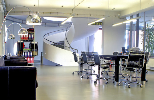The old and the new complement each other. The storeroom is located in the existing structure, the salesroom and offices in the new. They are united on the outside by the perforated building envelope and inside by the atrium. The construction is a reinforced concrete skeleton. Although the old structure has been completely absorbed by the new one, it is still clearly defined by rectangular columns and visible beams, whilst the new structure utilizes stronger floor slabs, which are supported by circular columns throughout. Connecting the ground floor reception area to the upper-floor offices are two homogeneous, gently coiled concrete staircases. These are the focal point of the public area. The colour scheme alternates between black and white: a black facade, white interior walls and industrial flooring and then black again in the service spaces.