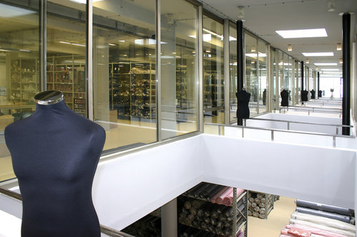 Most of the furniture was designed by the architects themselves and reinforces the black-and-white theme: white in the public areas, black in the office areas. To relieve the stark colour concept and add a little playfulness to the interior, the architects introduced some wall racks and horizontal bars in warm timber tones for a little light gymnastics or perhaps for the unfurling and presentation of textiles, which is, after all, the purpose of this building. A10, Fr., 2007.07.27