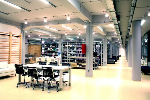 The introverted nature of the building is not only a reaction to its heterogeneous surroundings but a form of protection from the extreme climate which is marked by strong temperature fluctuations, summer and winter. The building consciously makes limited use of daylight as the storeroom requires none and the salesroom and workstations make additional use of a clear and simple lighting concept. The building, three stroreys high, breathes from the inside out: it has its own microclimate, which is regulated by a big, one-storey atrium and eight rooflights on the flat roof. The atrium can also be used as a terrace, accessible from the top floor.