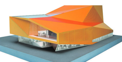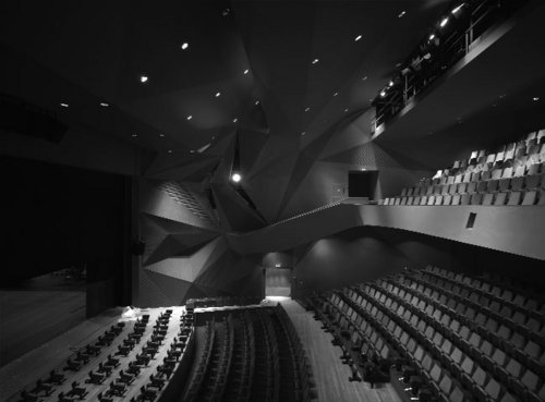 Die Typologie des Theaters ist an sich schon faszinierend. Ben van Berkel jedoch, den es immer auch interessiert, wie ein Gebäude mit den Menschen »kommuniziert«, wollte die (darstellerischen) Merkmale und Möglichkeiten von Theatern und der Architektur im Allgemeinen weit über das einfache »Funktionieren« hinaus nutzen. Die komplexe äußere Hülle entstand in diesem Fall zum Teil auch durch die Vorgabe, die zwei Hauptsäle aus akustischen Gründen so weit wie möglich voneinander entfernt anzuordnen. Folglich wurden ein größerer und ein kleinerer Saal, der Bühnenturm, mehrere eigenständige, aber miteinander verbundene Foyers, zahlreiche Umkleiden und Mehrzweckräume sowie ein Café und ein Restaurant alle innerhalb eines großen Volumens untergebracht, das sich geradezu dramatisch in unterschiedliche Richtungen erstreckt. Die überaus komplexe Hülle resultiert aber auch aus dem Wunsch nach einer einheitlicheren Silhouette, da der erhöhte Bühnenturm ansonsten eine visuelle Störung in der Stadt dargestellt hätte. Die Fassaden mit ihren scharfen Winkeln und hervorstehenden Flächen bestehen aus Metallplatten in Gelb und Orangetönen sowie Glas. Die zahlreichen Vorsprünge ermöglichen Orte, an denen das »Zurschaustellen« hinter den Kulissen fortsetzt und die Schauspieler und Zuschauer gewissermaßen ihre Rollen tauschen. Der Aufenthaltsbereich der Künstler befindet sich beispielsweise direkt über dem Haupteingang, so dass diese durch ein großes, geneigtes Fenster das Publikum beobachten können, wie es sich dem Theater nähert.