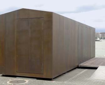 Der besondere Reiz, und das führt zum eingangs erwähnten Vergleich mit der Newtons Gesetz der Gravitation enthobenen Welt der Werbespots, liegt in der scheinbaren Schwerelosigkeit der metallenen Körper. Auf den ersten flüchtigen Blick ist vom Tragwerk nichts zu spüren und man wird – wie in einem Werbespot – zum wiederholten, intensiven Hinschauen gezwungen. Die Metallboxen werden jeweils nur von zwei flachen, verspiegelten, außermittig im ersten Drittel angeordneten Fachwerkstützen getragen. Ihr extrem schlanker Querschnitt entspricht der Wanddicke der Boxen. Zwei Abspannseile halten, fast unsichtbar, die beachtliche Auskragung von 22 Metern in der Balance.