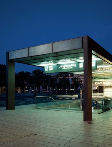 Wo täglich tausende Passanten vorbeieilen, ankommen, umsteigen, weiterfahren oder sich treffen, können die beiden neuen Zugangsbauten zur S- und U-Bahn schnell mal übersehen werden. Erst recht im städtebaulichen Umfeld des Jungfernstieg an der Hamburger Binnenalster. Die beiden nahezu identischen Bauten überdachen mit einer weit spannenden Stahlkonstruktion jeweils die Treppenanlage – präzise detailliert, kraftvoll in ihrer Wirkung und doch zurückhaltend.